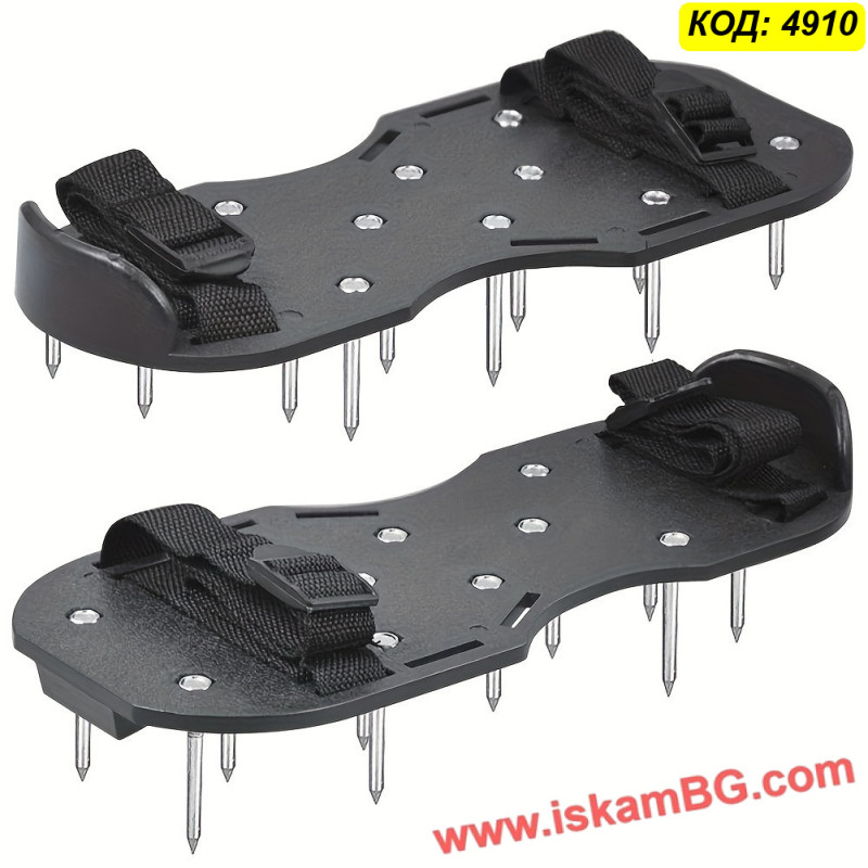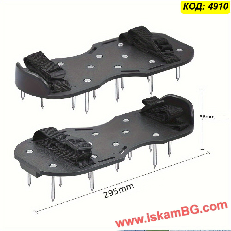Конструкцията представлява здрава основа от PP пластмаса, която се прикрепя стабилно към вашите работни обувки или ботуши чрез регулируеми текстилни ремъци с катарами. В долната част са разположени дълги метални шипове, които при всяка стъпка пробиват почвата и създават вертикални канали.