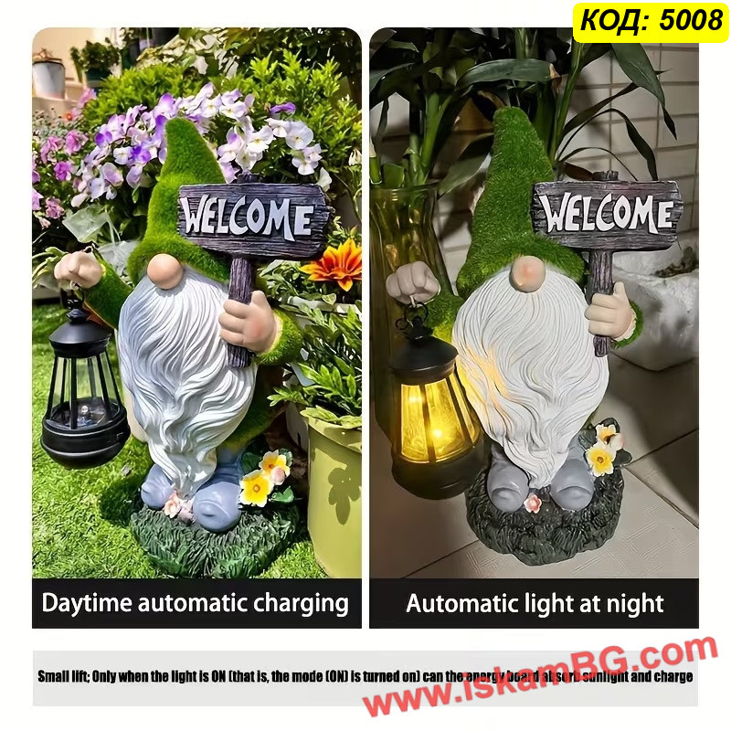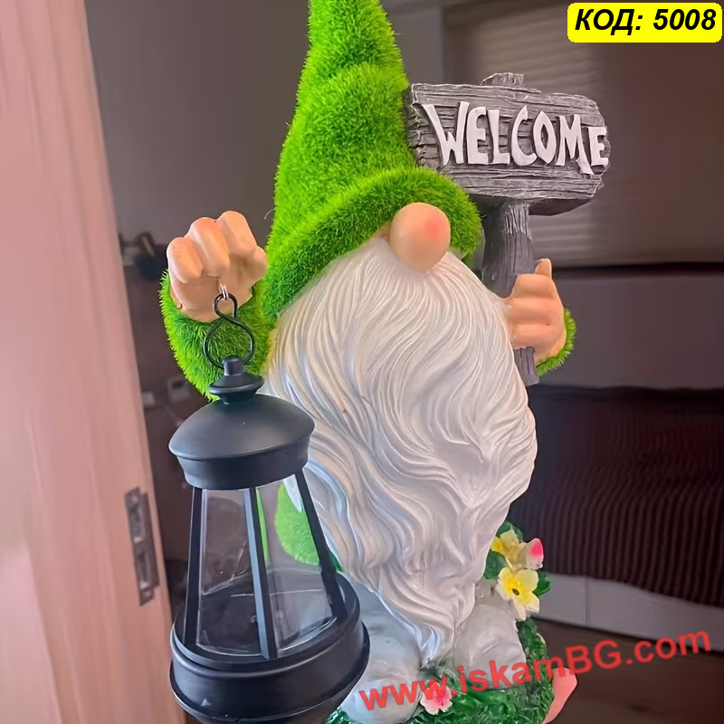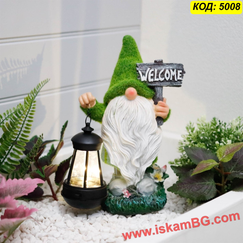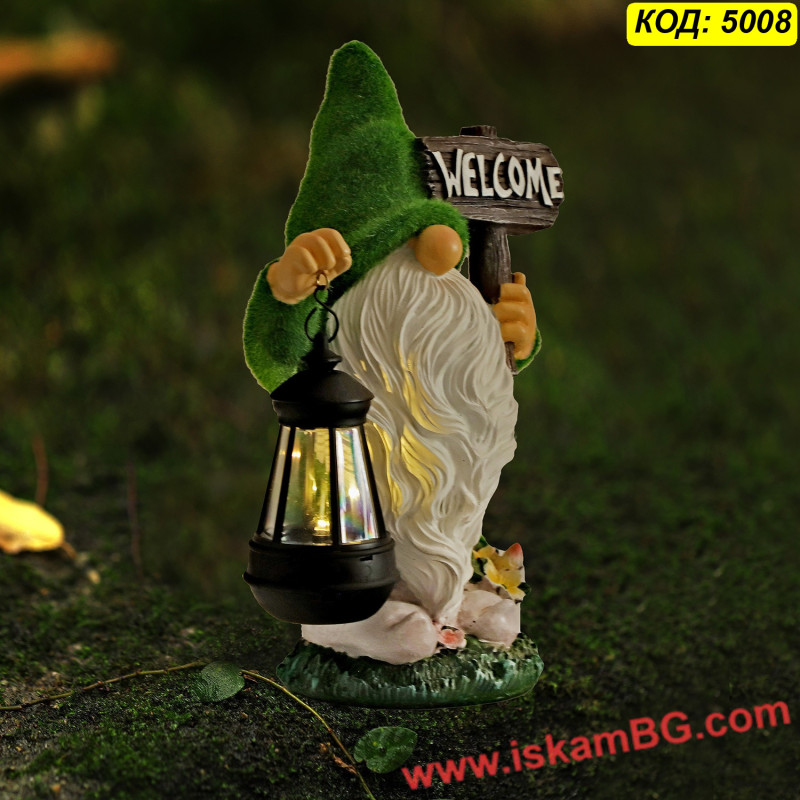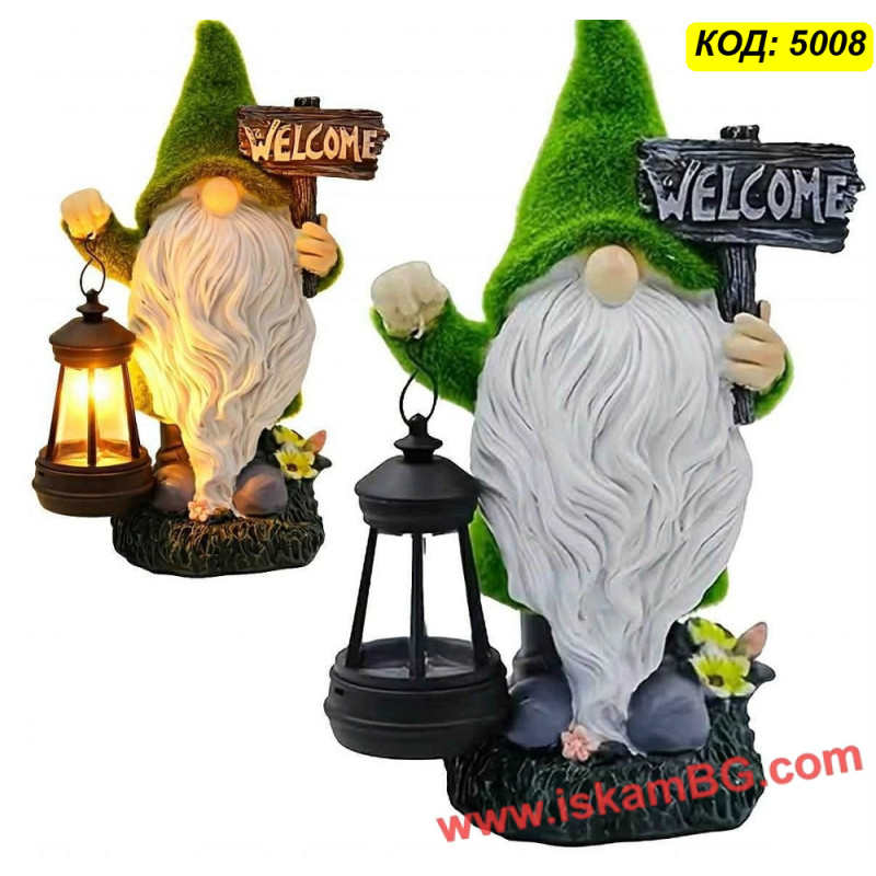 Декоративна градинска фигура на гном (джудже) със соларно LED осветление и табела „Welcome“    Виж пълното описание