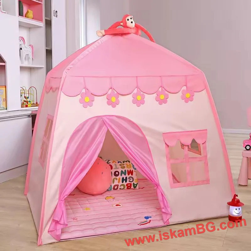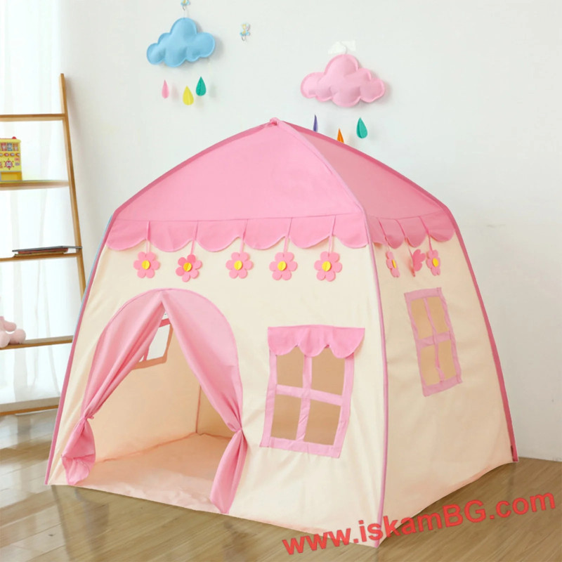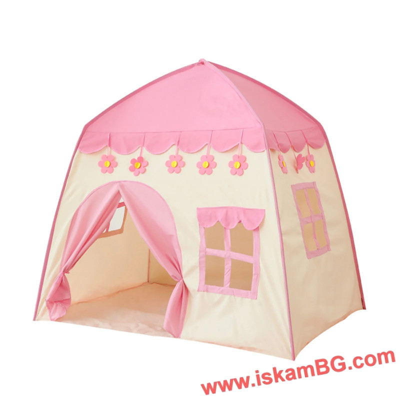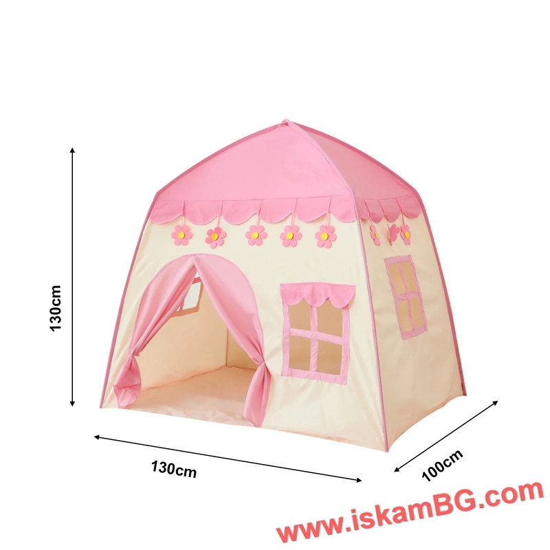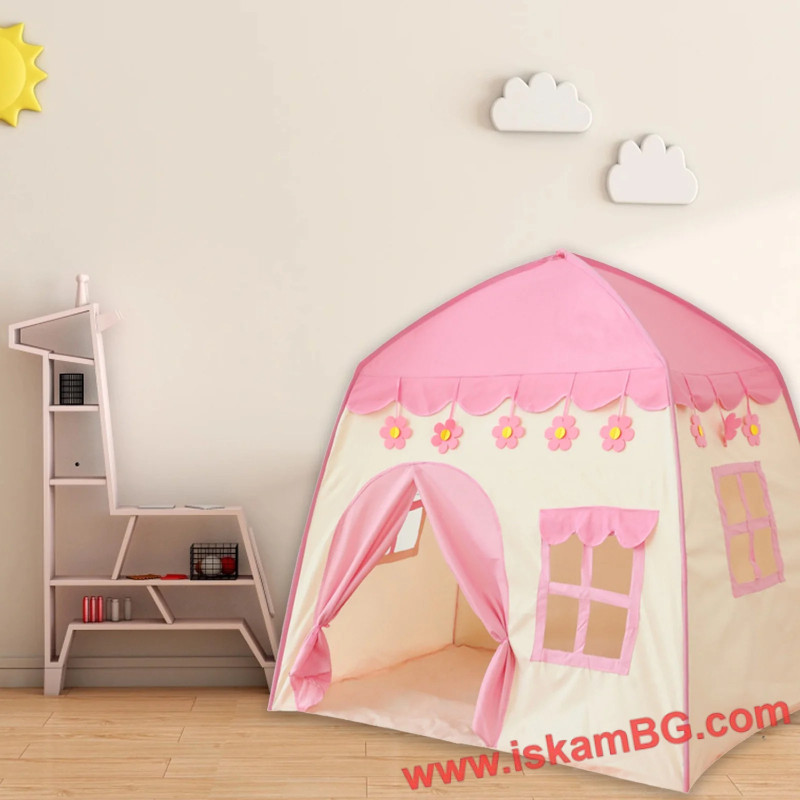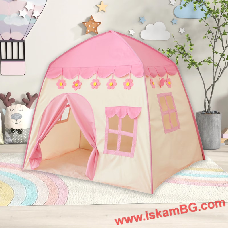 Превърнете детската стая във вълшебно кралство с тази очарователна розова палатка. Създадена като истински "Замък за принцеси", тя е перфектното лично пространство, където вашето дете може да развихри въображението си. Това е идеалният уютен кът за четене на приказки, за следобедна почивка или за весели игри с приятели. За разлика от pop-up моделите, тази палатка е по-просторна и стабилна, благодарение на лесната за сглобяване конструкция с рейки. Красивият дизайн с цветенца и прозорчета я прави не само страхотна играчка, а и чудесна декорация за стаята.