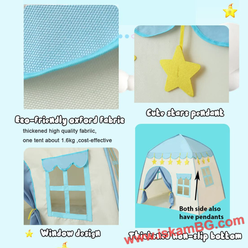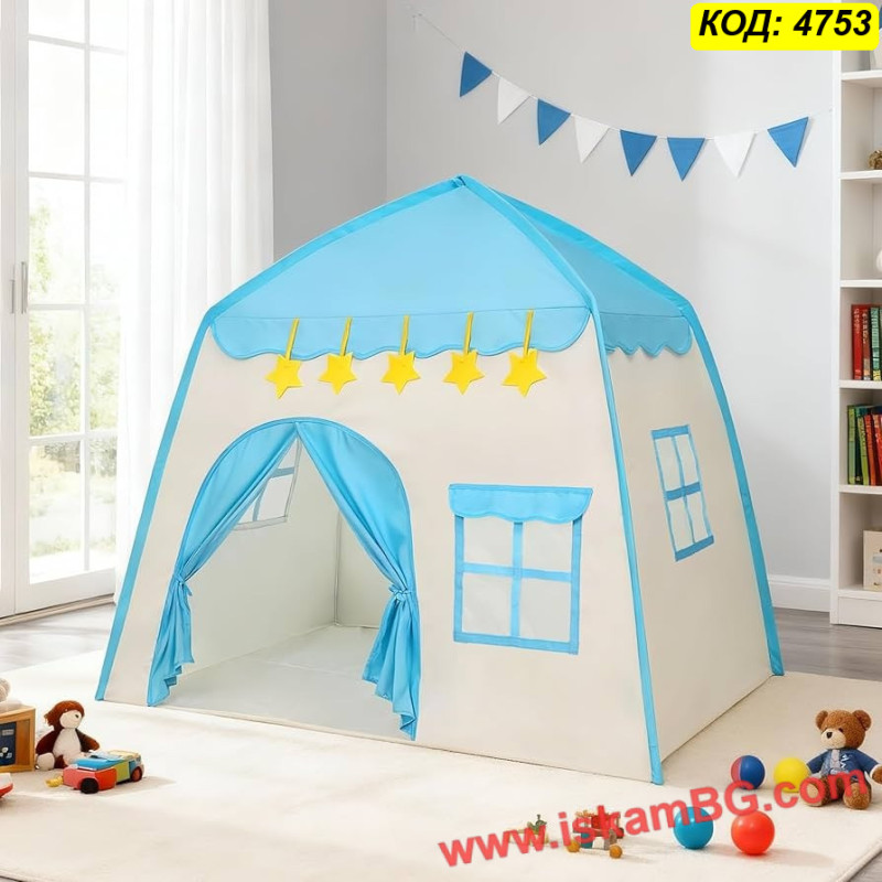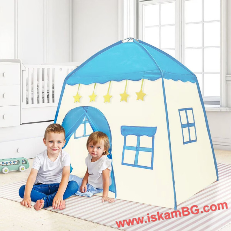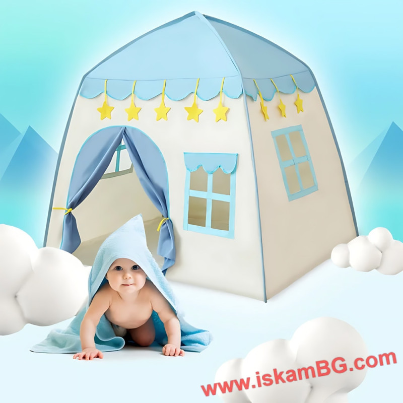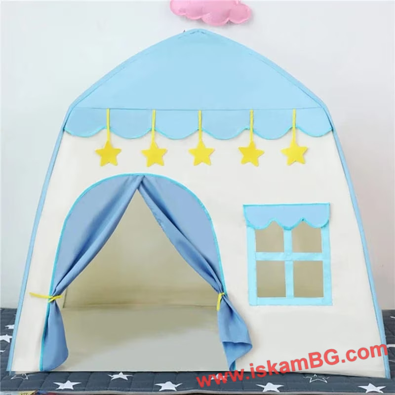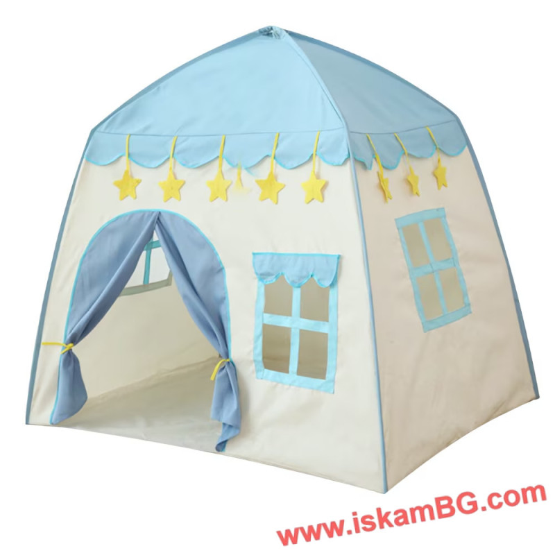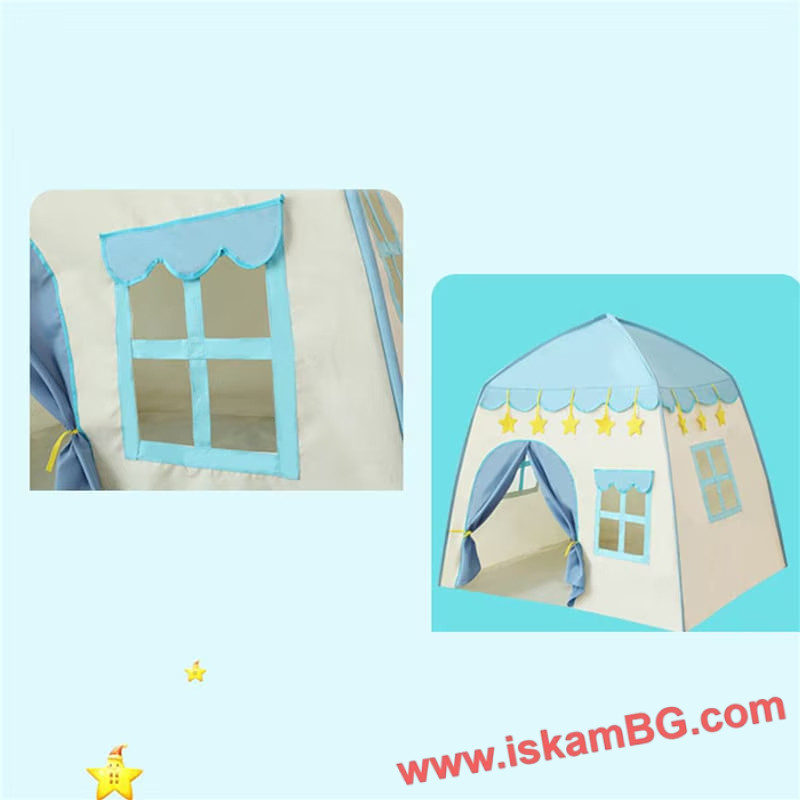 Превърнете стаята в мечтано място с тази синя детска палатка къща. Украсена със звезди, тя е идеалната къщичка за игра, четене и приключения. Лесна за сглобяване, стабилна и перфектна за всяка детска стая.    Виж пълното описание