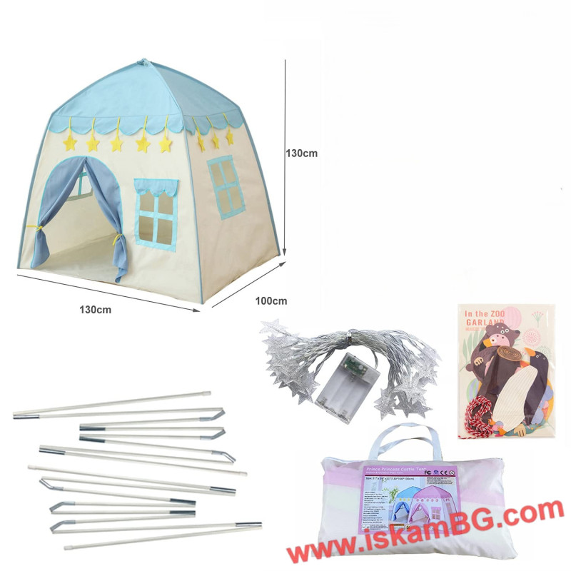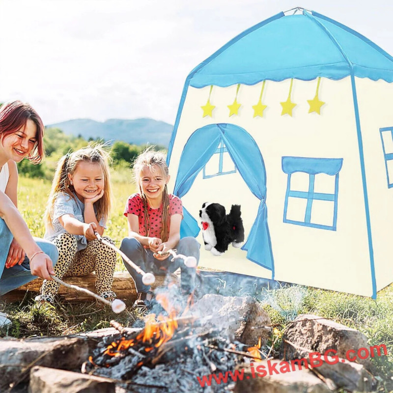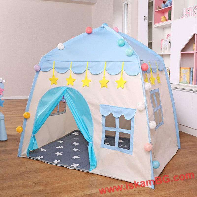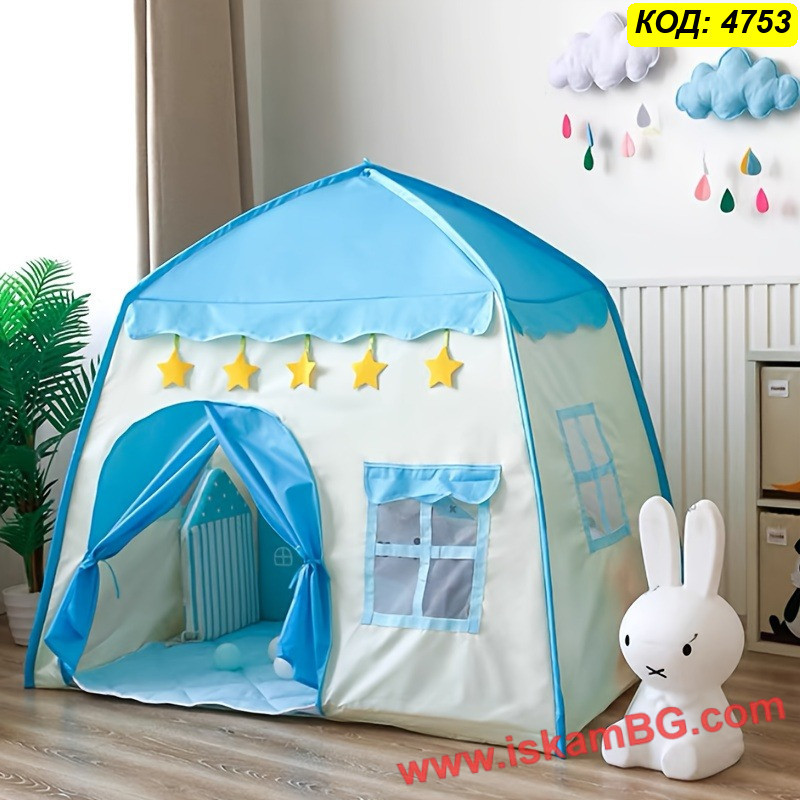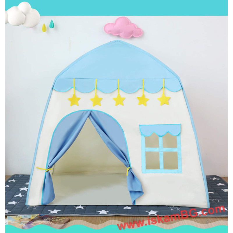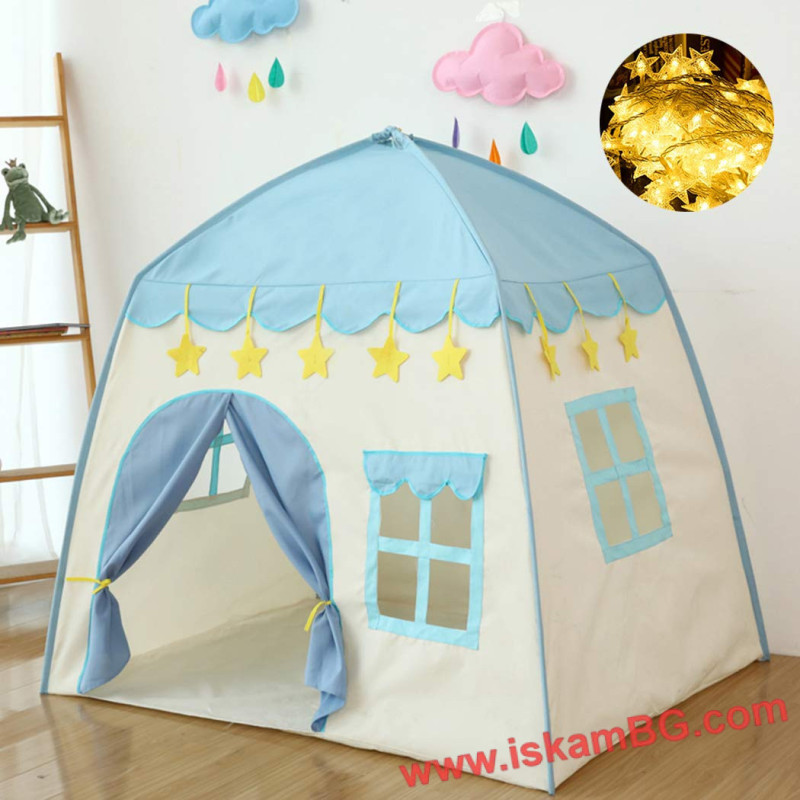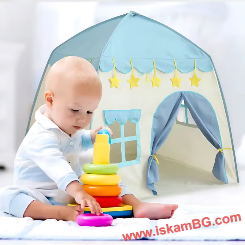 Превърнете стаята в мечтано място с тази синя детска палатка къща. Украсена със звезди, тя е идеалната къщичка за игра, четене и приключения. Лесна за сглобяване, стабилна и перфектна за всяка детска стая.    Виж пълното описание