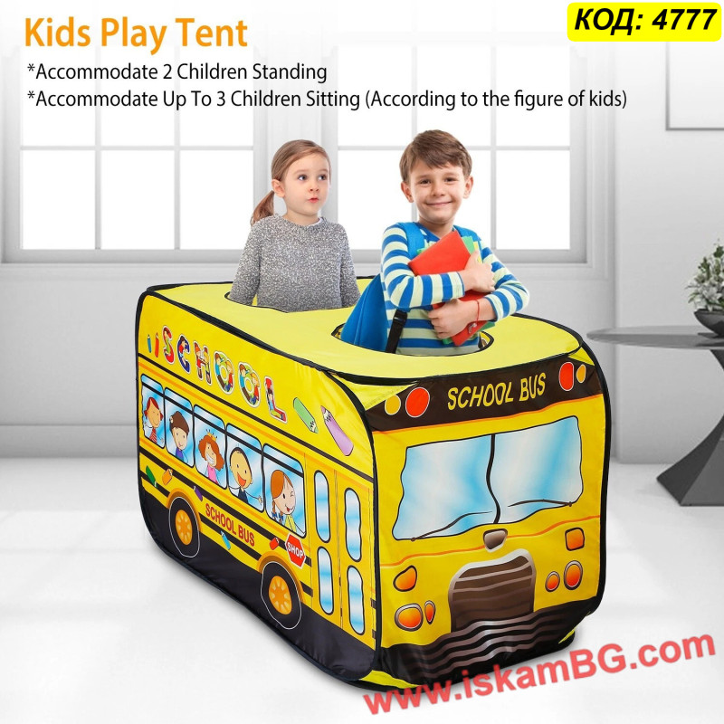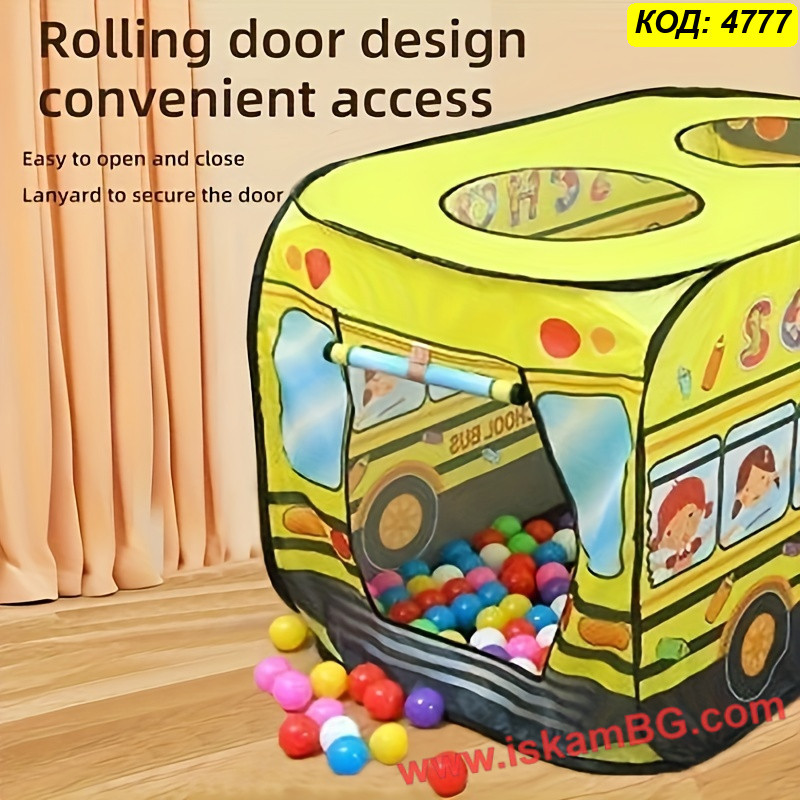 Превърнете стаята в спирка на забавлението с тази страхотна детска палатка "Автобус". Със светкавичен pop-up дизайн и компактна чанта за съхранение, тя е перфектният подарък, готов за игра за секунди.