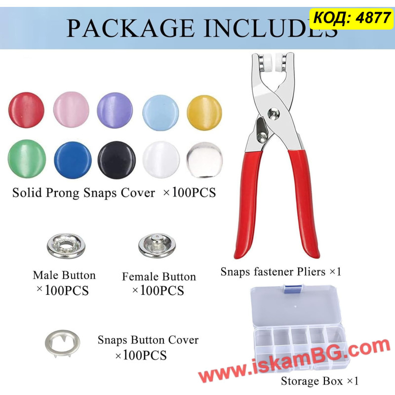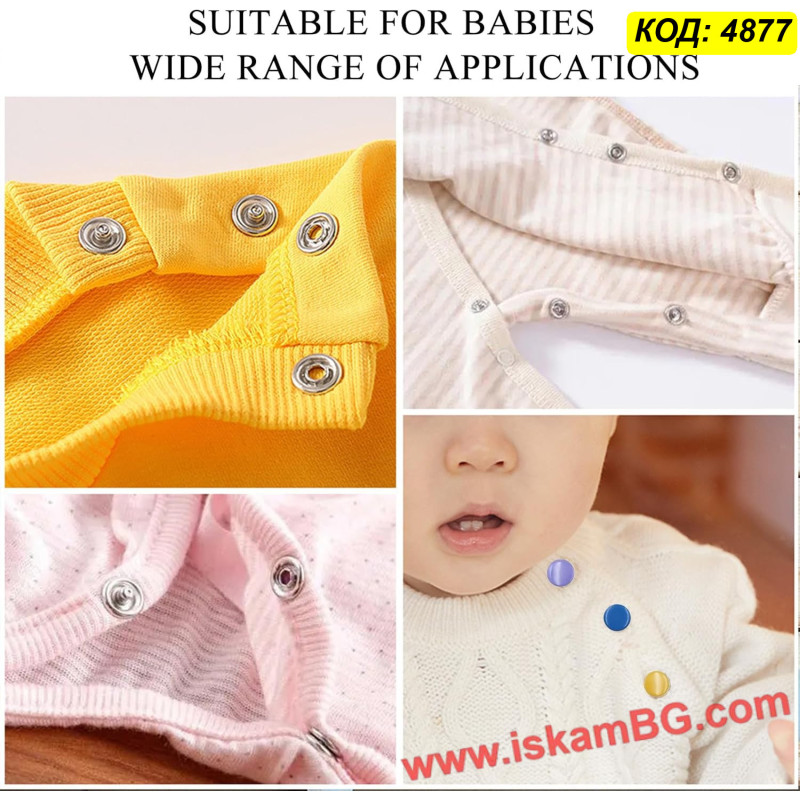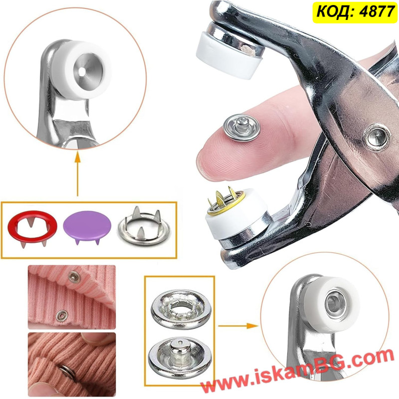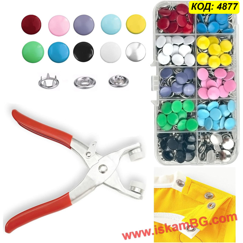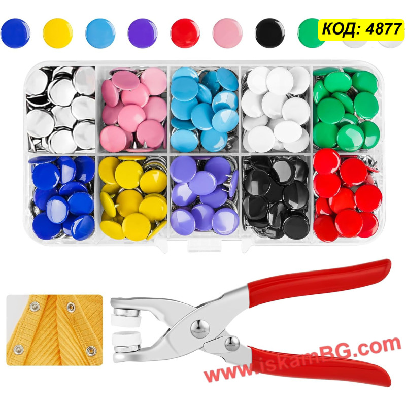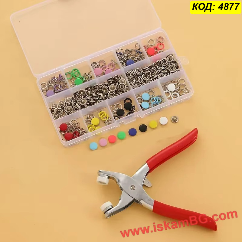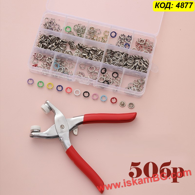Получавате професионални метални клещи (преса), които правят поставянето на капси детска игра, заедно с прецизно подбрана селекция от 50 пълни копчета в различни свежи цветове. Копчетата са с "отворен пръстен" (open ring) или плътни капачета (в зависимост от конкретната доставка/партида), идеални за прикрепяне към трикотаж, памук и други тънки материи.