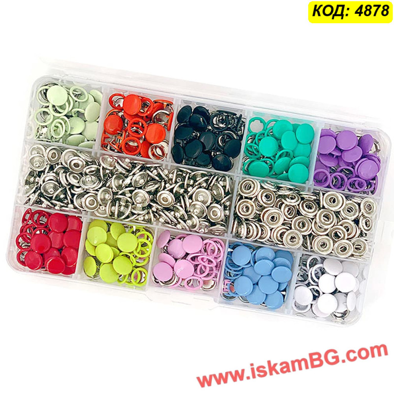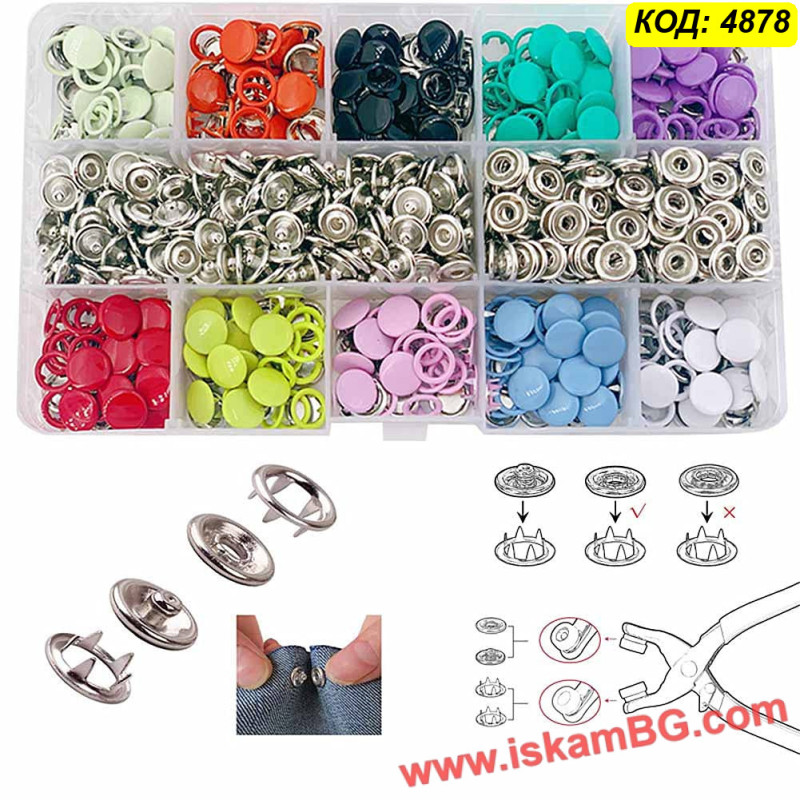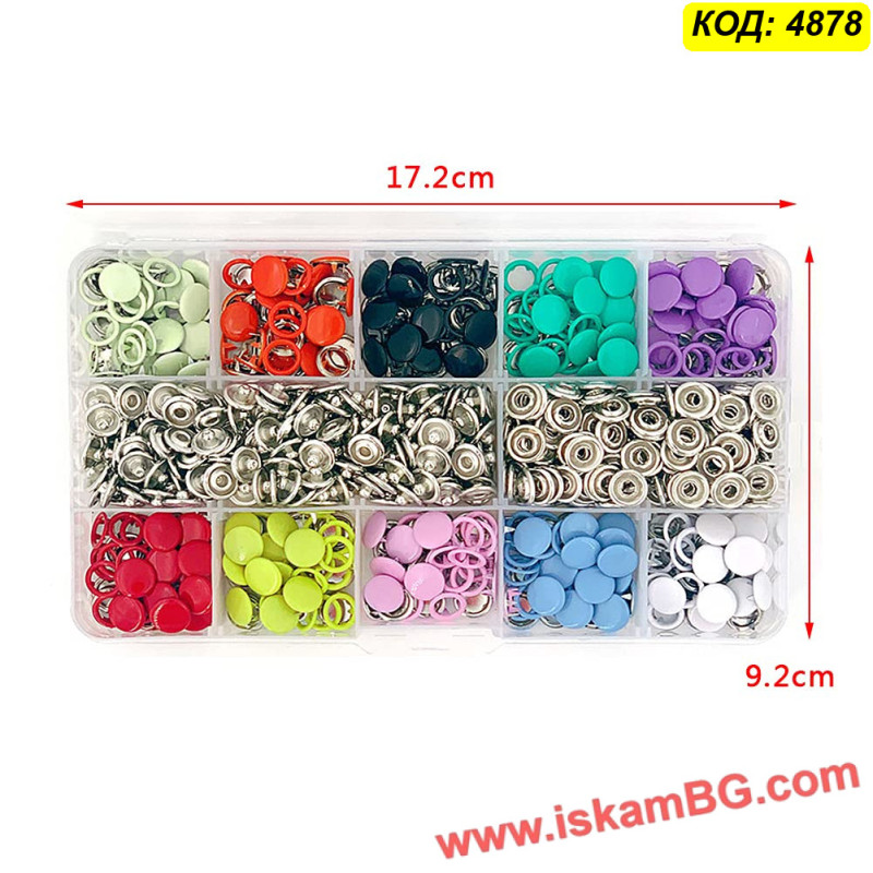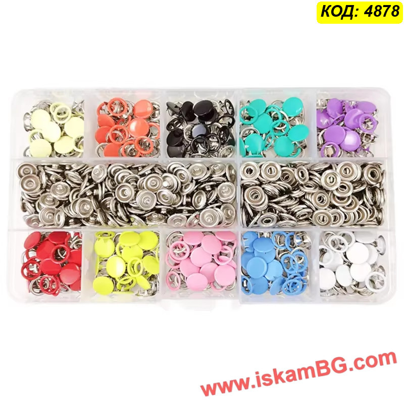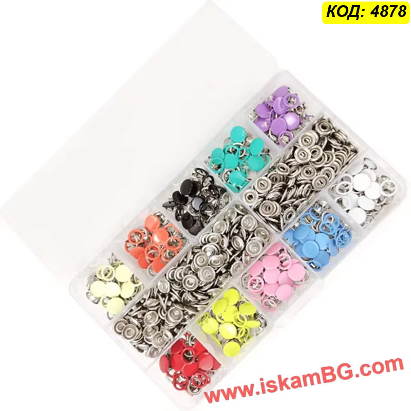 Комплектът съдържа внушителните 200 закопчалки в 10 свежи цвята. За разлика от обикновените "кухи" модели, тези копчета са с плътни цветни капачета. Те стоят изключително стилно и професионално върху бебешки бодита, жилетки, спални чувалчета и портмонета, като наподобяват фабрично поставените копчета на марковите дрехи.