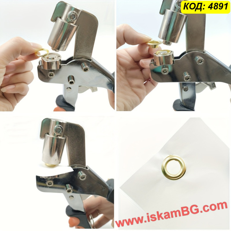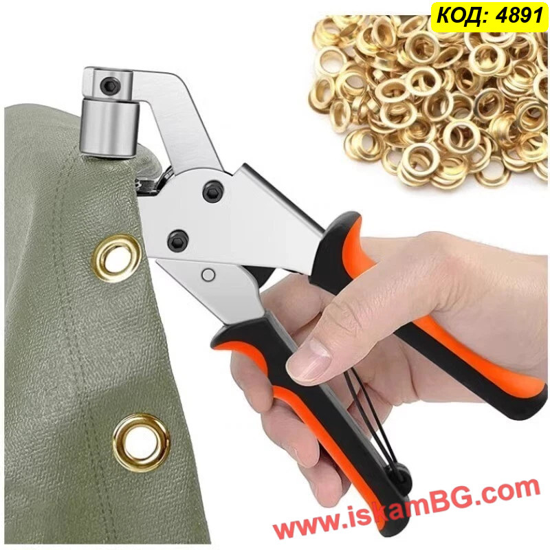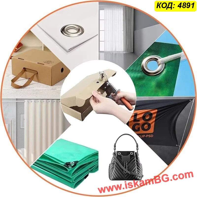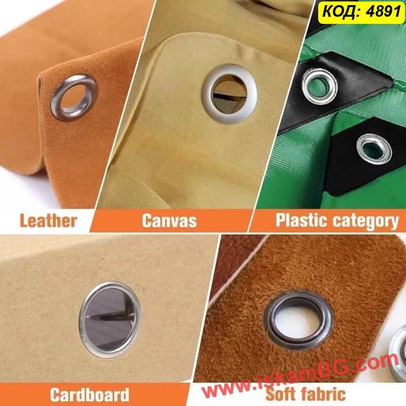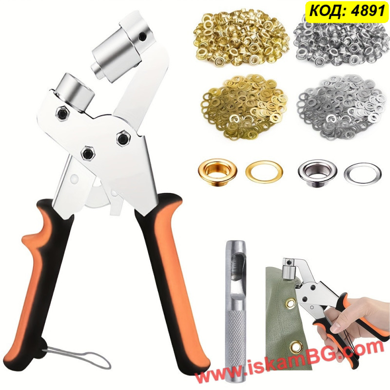 Този комплект включва усилени клещи за поставяне на капси и голям набор от метални халки (капси). Инструментът разполага с магнитен механизъм, който задържа капсата стабилно преди пресоване, осигурявайки прецизен монтаж с една ръка. Подходящ е за ремонт на покривала, тенти, банери и кожени изделия.