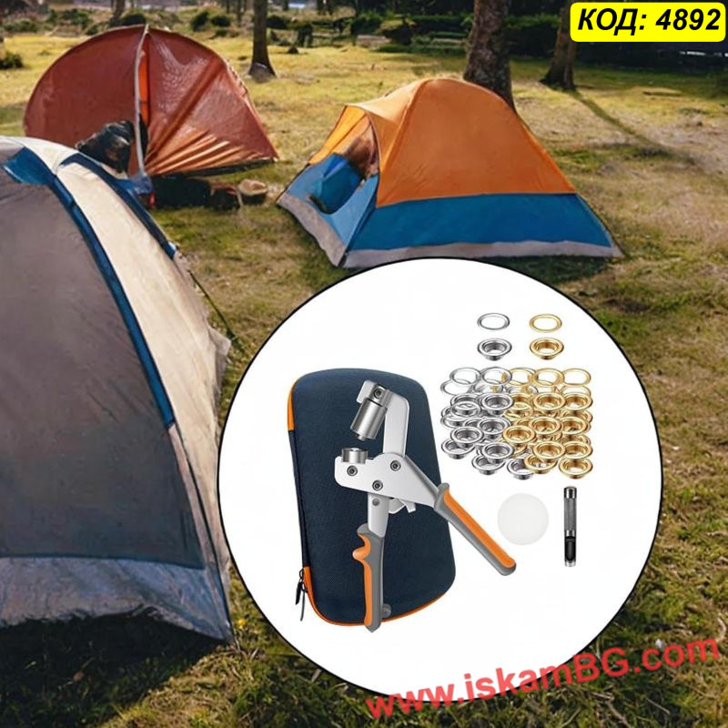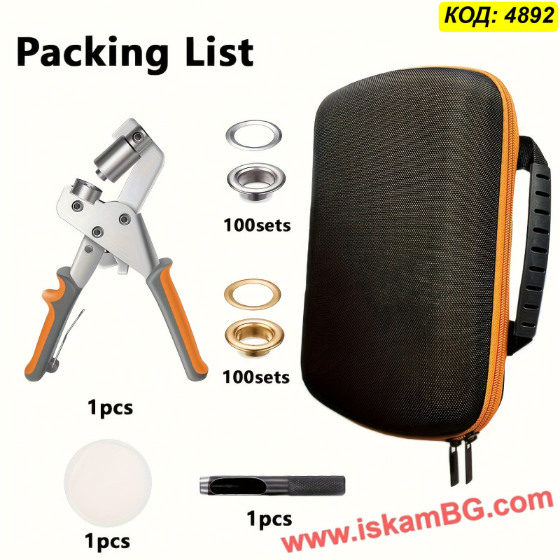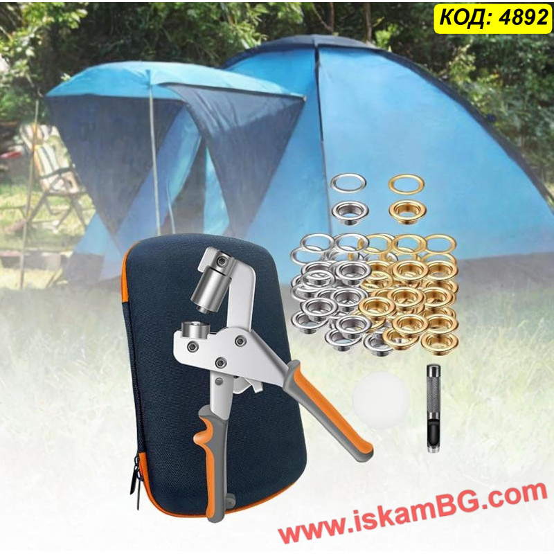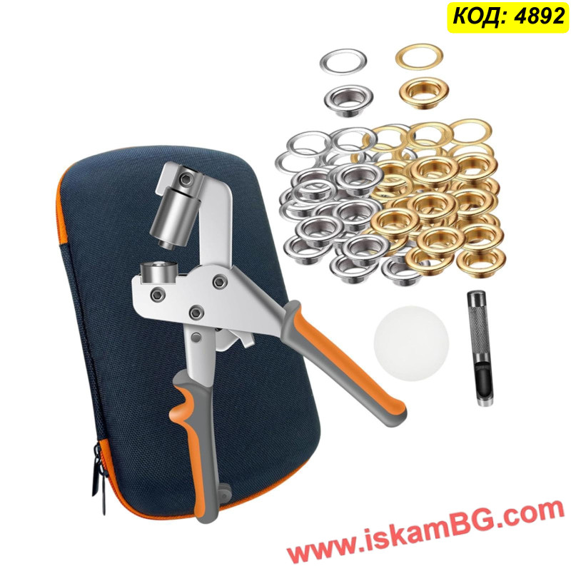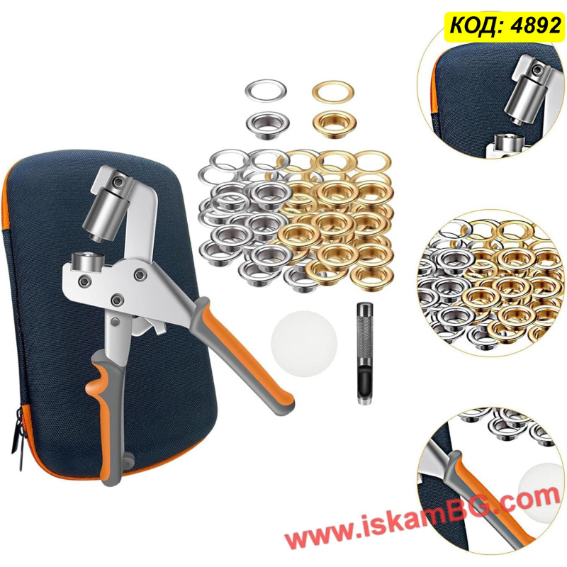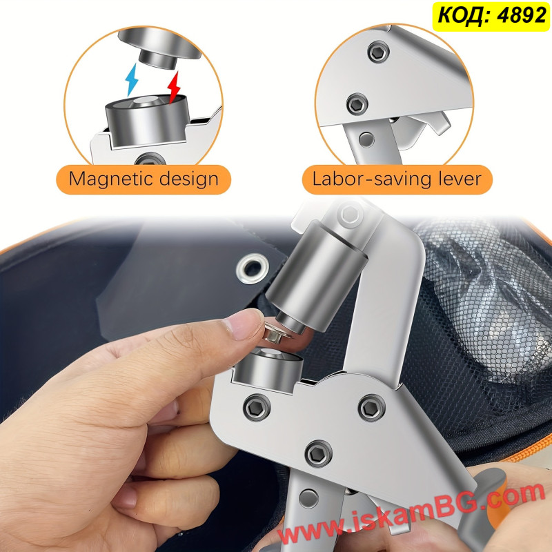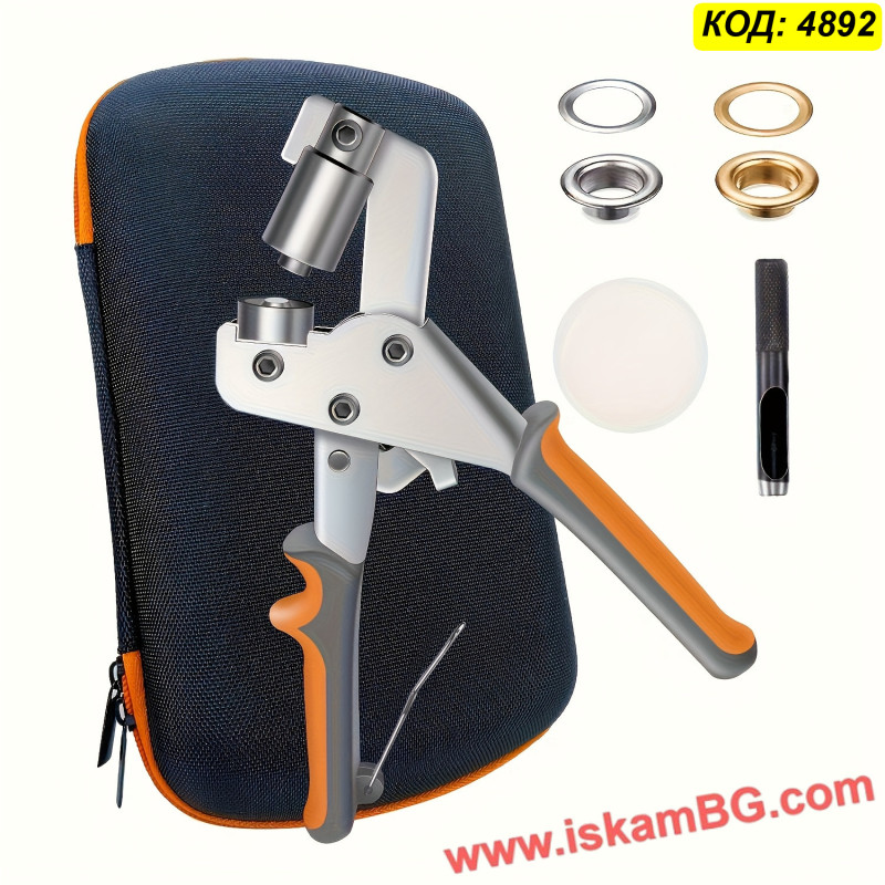 Този комплект включва усилени клещи за поставяне на капси и голям набор от метални халки (капси). Инструментът разполага с магнитен механизъм, който задържа капсата стабилно преди пресоване, осигурявайки прецизен монтаж с една ръка. Подходящ е за ремонт на покривала, тенти, банери и кожени изделия.