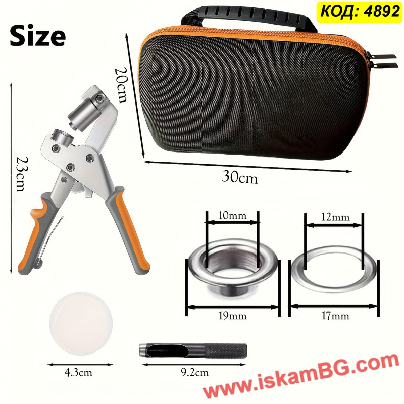 Този комплект включва усилени клещи за монтаж на капси, инструмент за предварително пробиване на отвори и кутия за съхранение. Инструментът е снабден с магнитна глава за лесно задържане на халките по време на работа. Идеален за ремонт на покривала, чанти, дрехи и рекламни винили.    Виж пълното описание