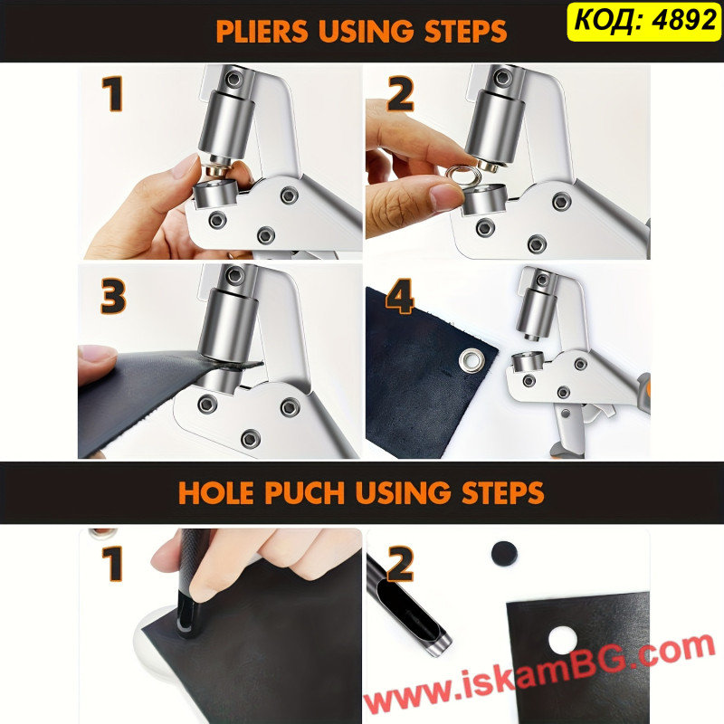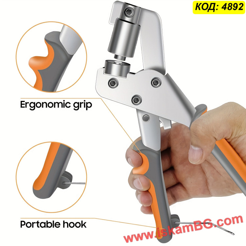 Този комплект включва ръчна преса (клещи) за капси със специален ергономичен дизайн, намаляващ усилието при натиск. Инструментът е изработен от масивен метал със защитно покритие и разполага с удобни гумирани дръжки против плъзгане. Подходящ за монтаж на капси с размер 10 мм върху брезенти, винил, кожа и текстил, без нужда от чук.