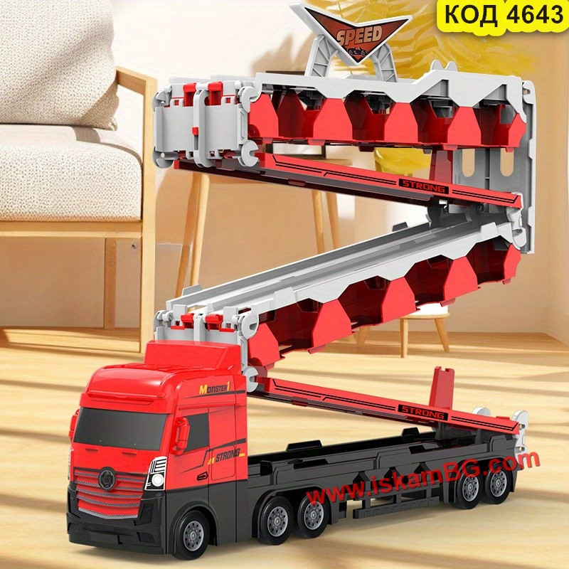 Функции: Лесно трансформиране от камион в дълга състезателна писта; Двуетажен органайзер