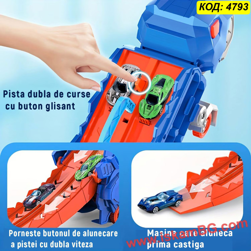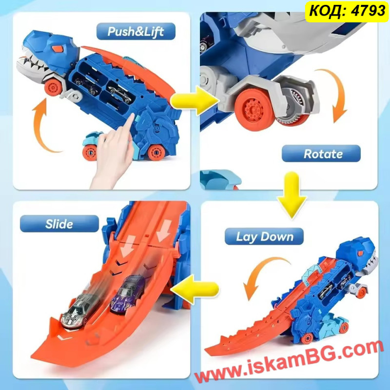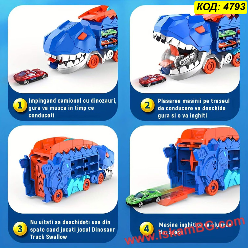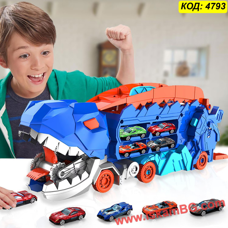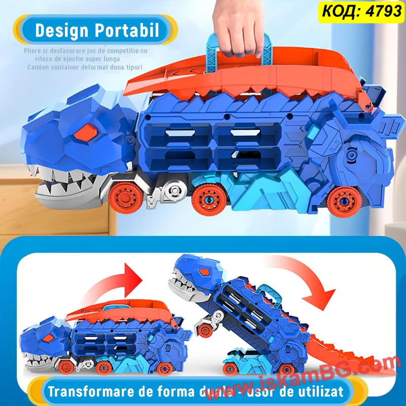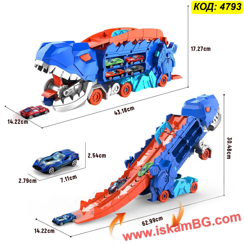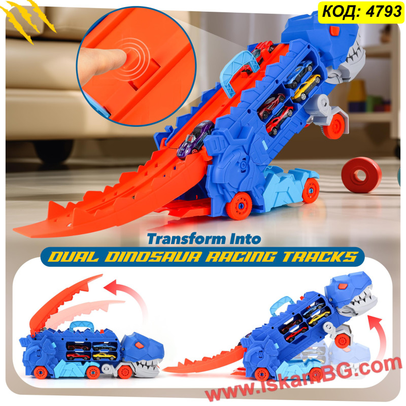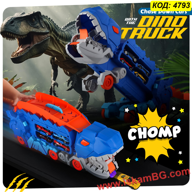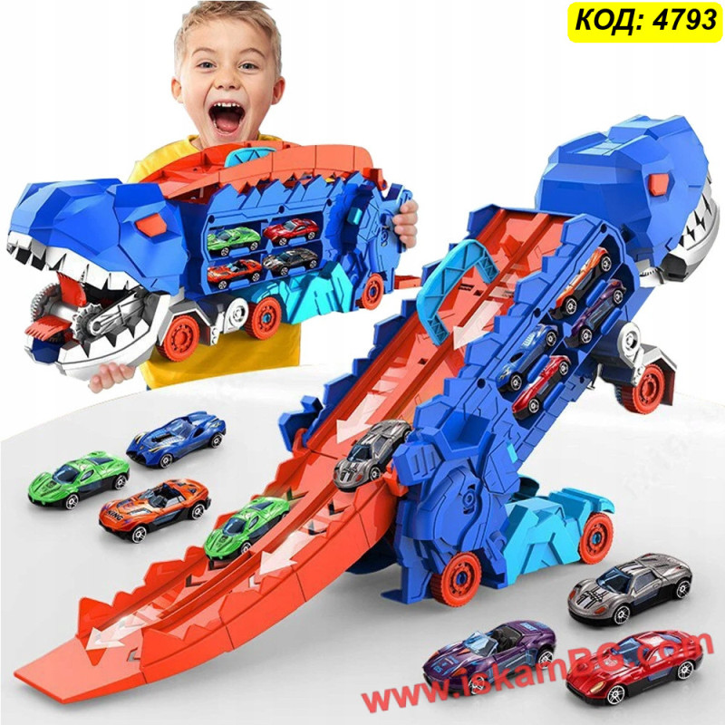 Готови за див екшън? Този голям син камион Динозавър (T-Rex) има уникална функция – движете го напред и той ще "изяде" малките колички през устата си! Освен това се трансформира в дълга писта за спускане на коли.    Виж пълното описание