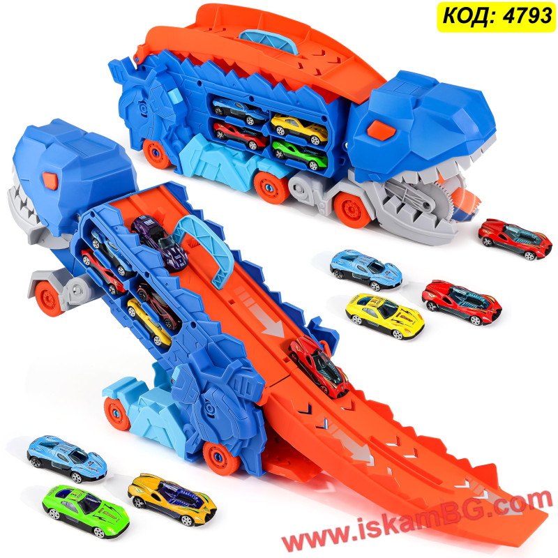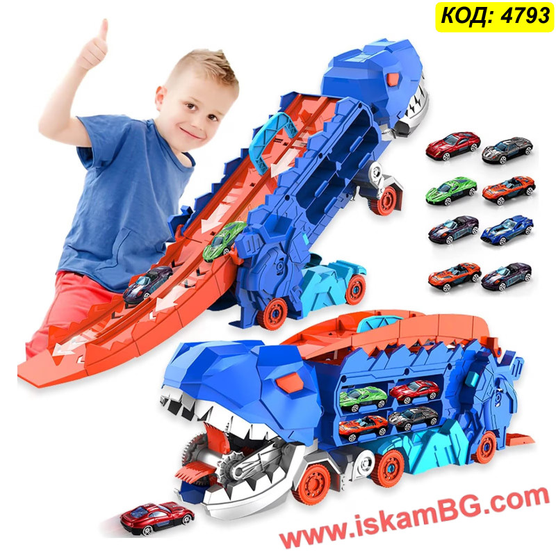 Камион Динозавър – T-Rex Писта и Автовоз 2-в-1 с 8 броя колички