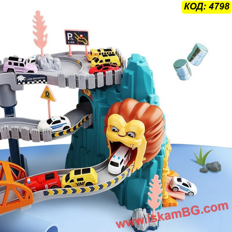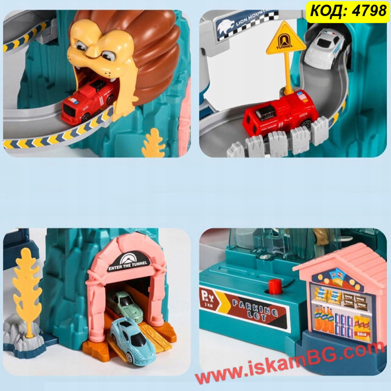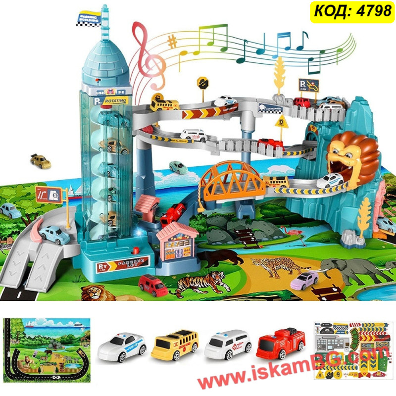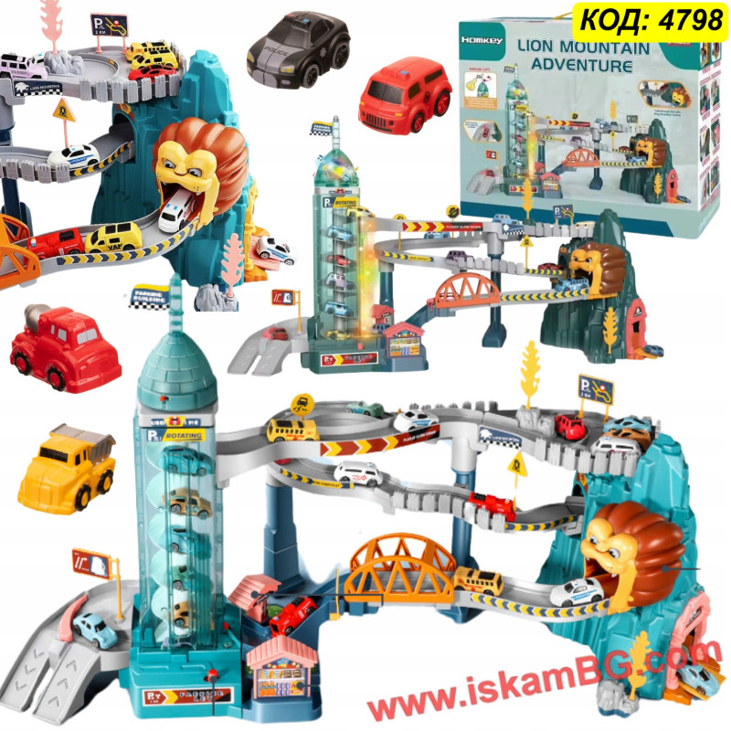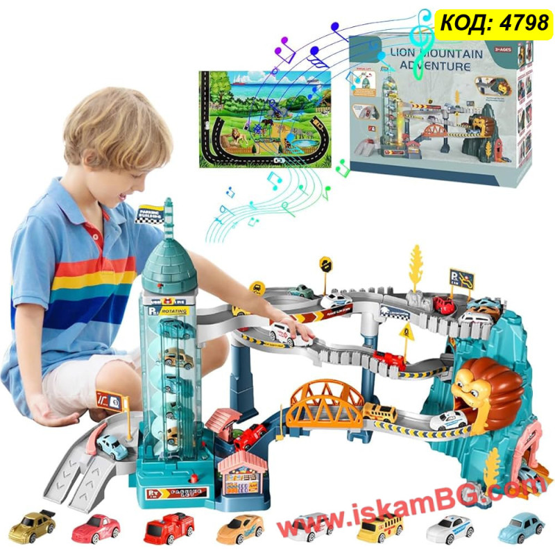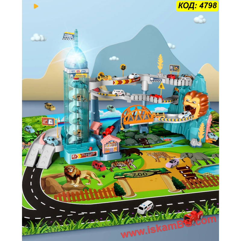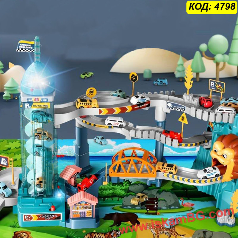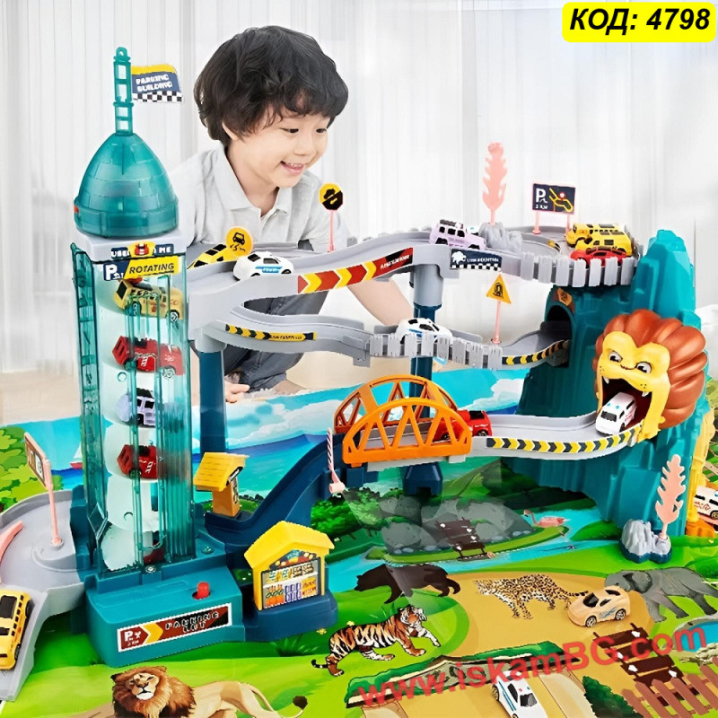 Впуснете се в незабравимо Сафари приключение с този гигантски XXL многоетажен паркинг с писта! Този комплект е проектиран да осигури часове игра, съчетавайки в себе си паркинг кула, бърза писта и дива природа. Основният акцент пада върху иновативния електрически асансьор, който сам издига количките до най-високото ниво, симулирайки истински многоетажен паркинг. От върха, автомобилите се спускат по дълги, спираловидни рампи, преминавайки през атрактивната Лъвска пещера на финала. Вградените светлини и звуци правят играта още по-реалистична и стимулират въображението на детето, докато то се учи да управлява трафика и да развива координацията си. Този детски гараж играчка е съвместим с повечето стандартни малки автомобили, което го прави чудесно допълнение към всяка колекция.