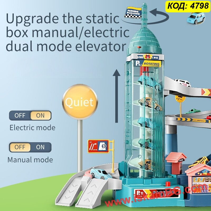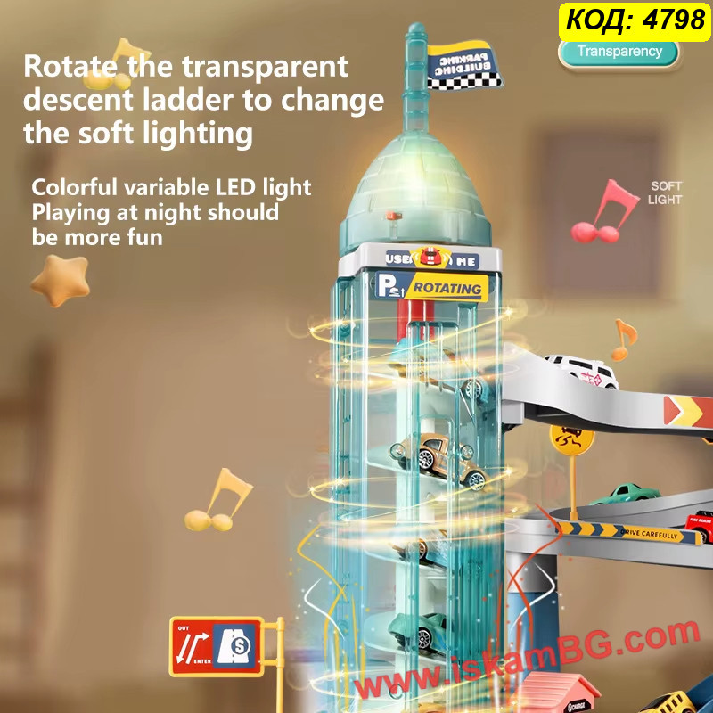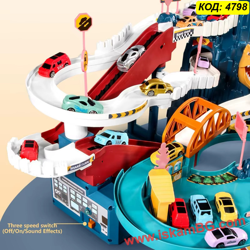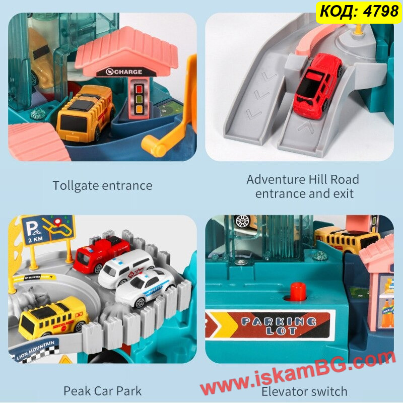 Конструкция: Многоетажен паркинг (4+ нива), гараж-кула и приключенска писта.