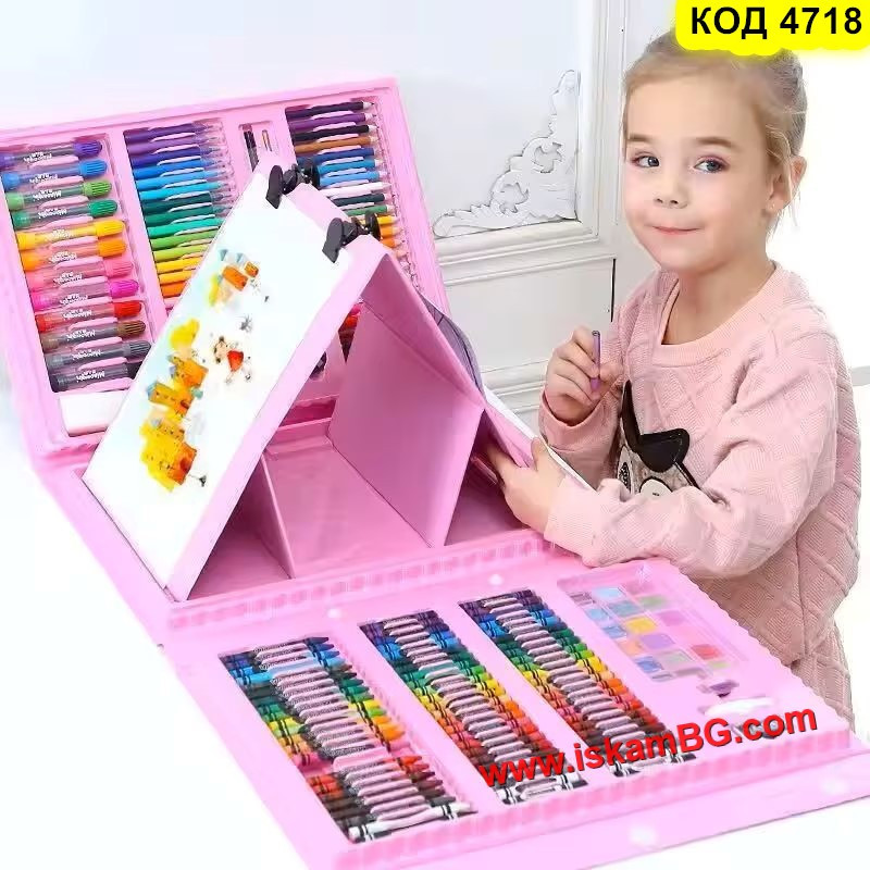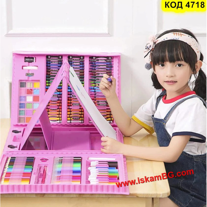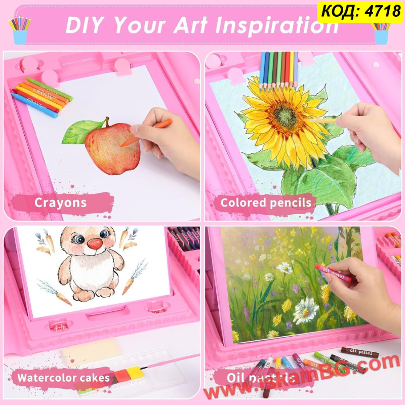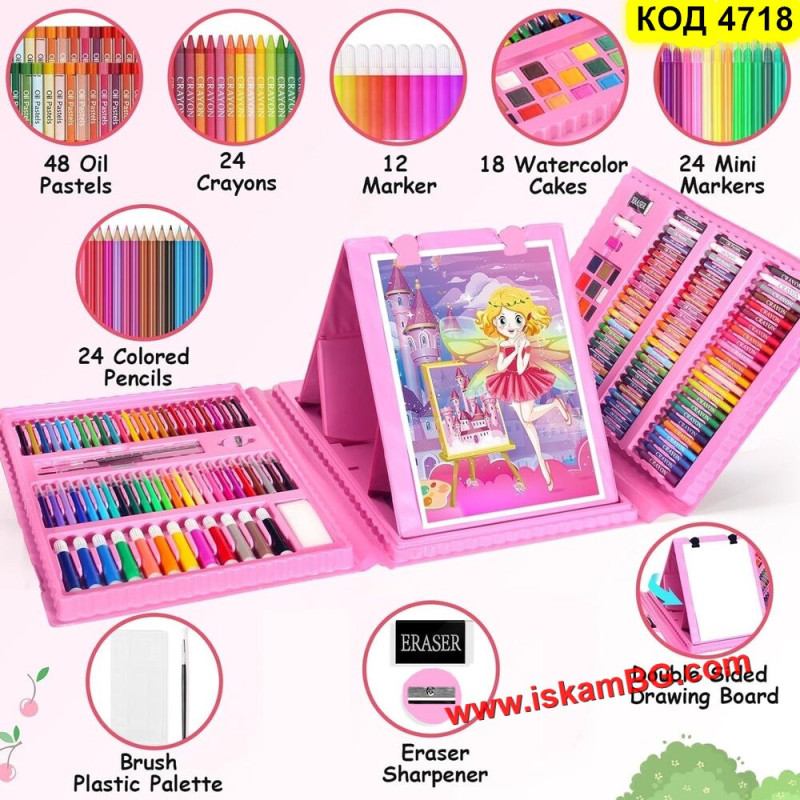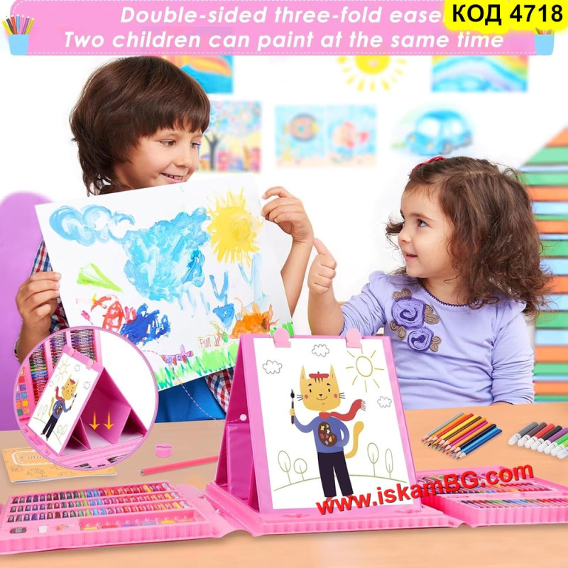 Създаден в нежен розов цвят, този XXL арт комплект не е просто кутия с пособия – той е преносимо арт студио. Най-впечатляващата му характеристика е, че цялото куфарче се разгъва и трансформира в двустранен статив, позволявайки на две деца да рисуват удобно едновременно.