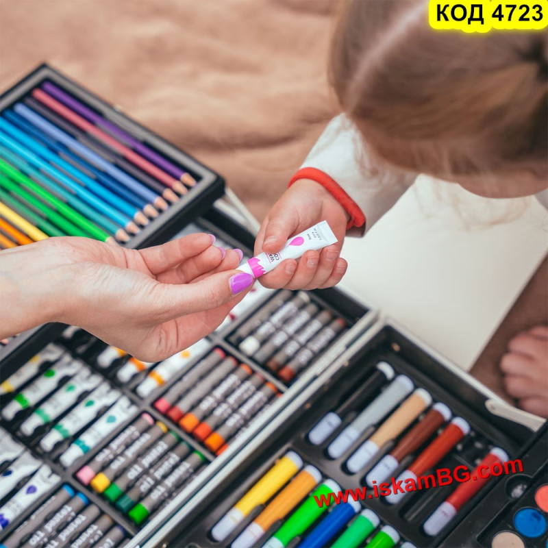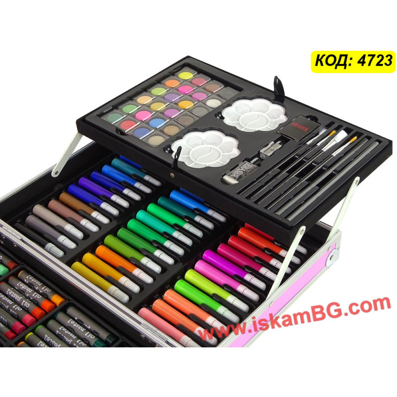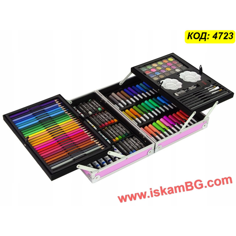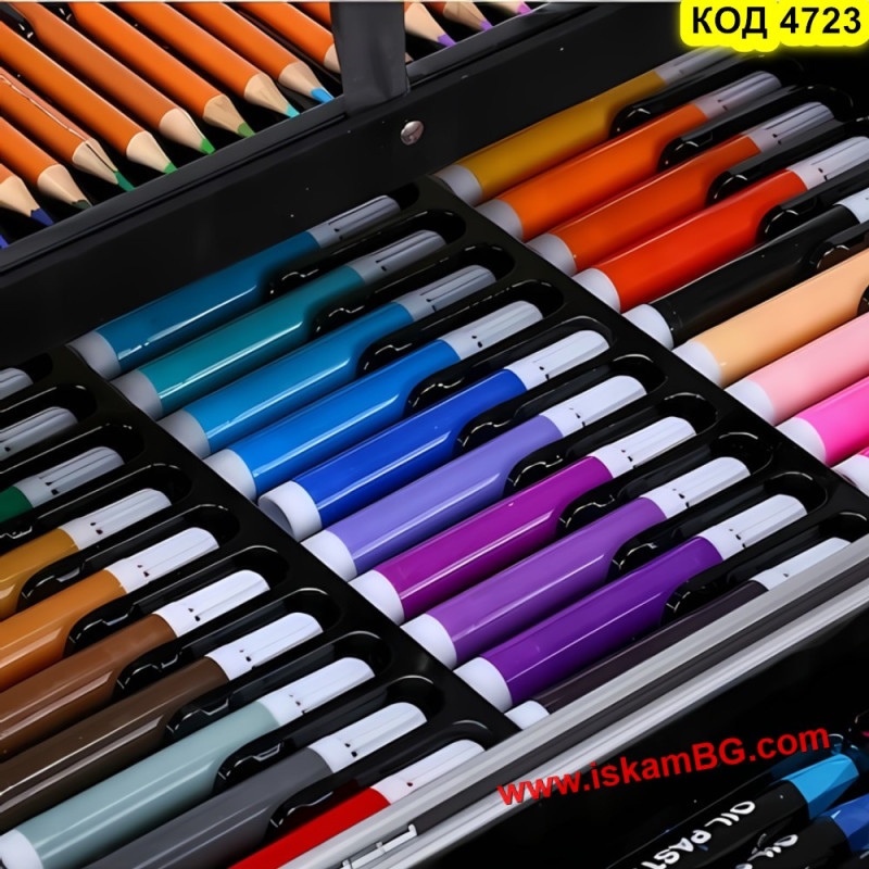 Разгърнете креативността си с този огромен арт комплект от 175 части. Събран в луксозен дървен куфар с чекмеджета, той съдържа всичко необходимо за рисуване и оцветяване – от моливи и пастели до акварелни бои и скицници.