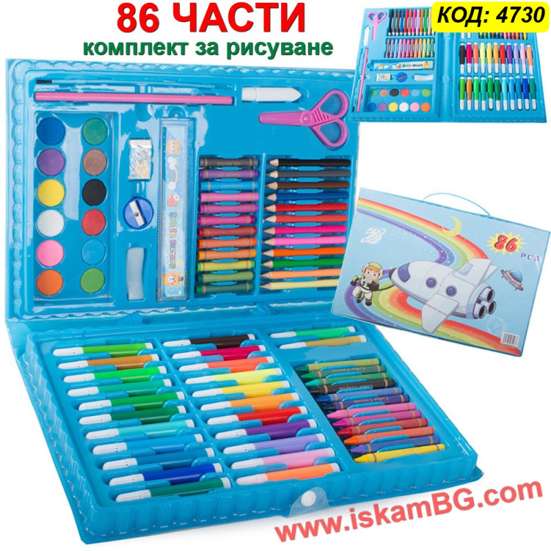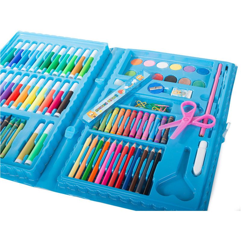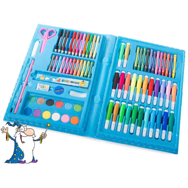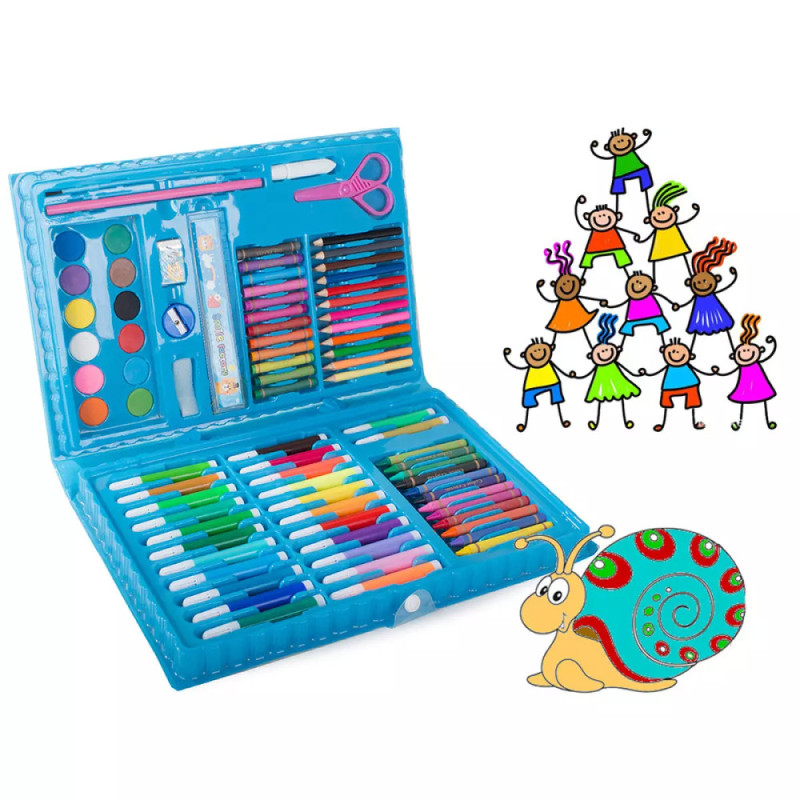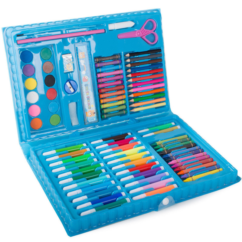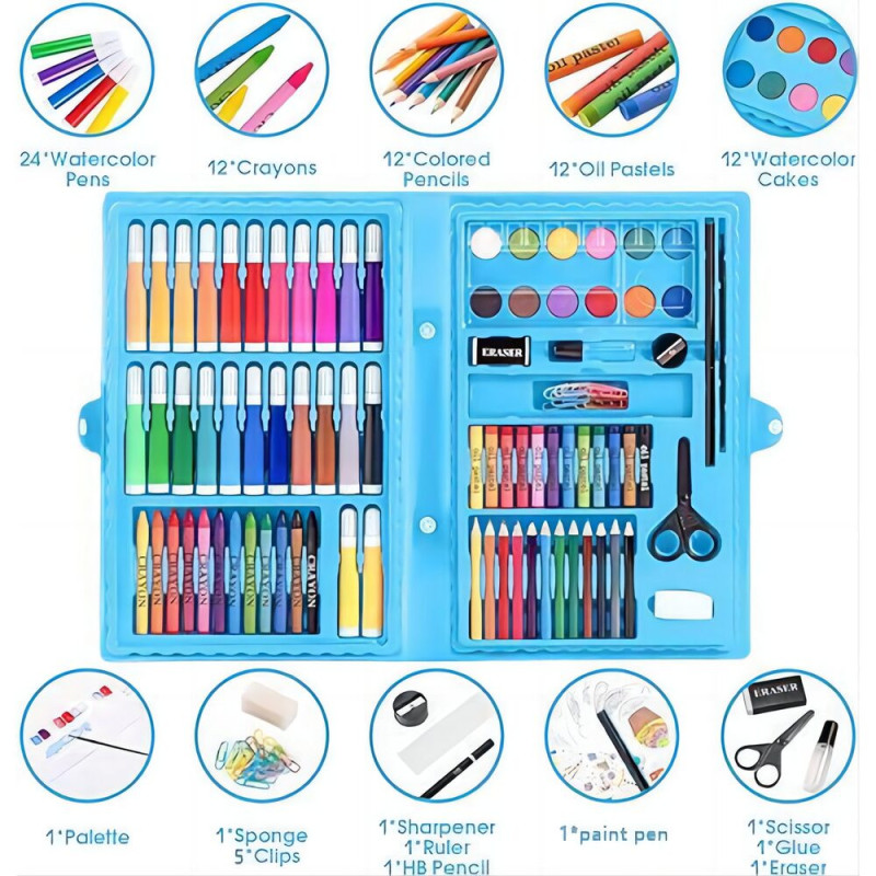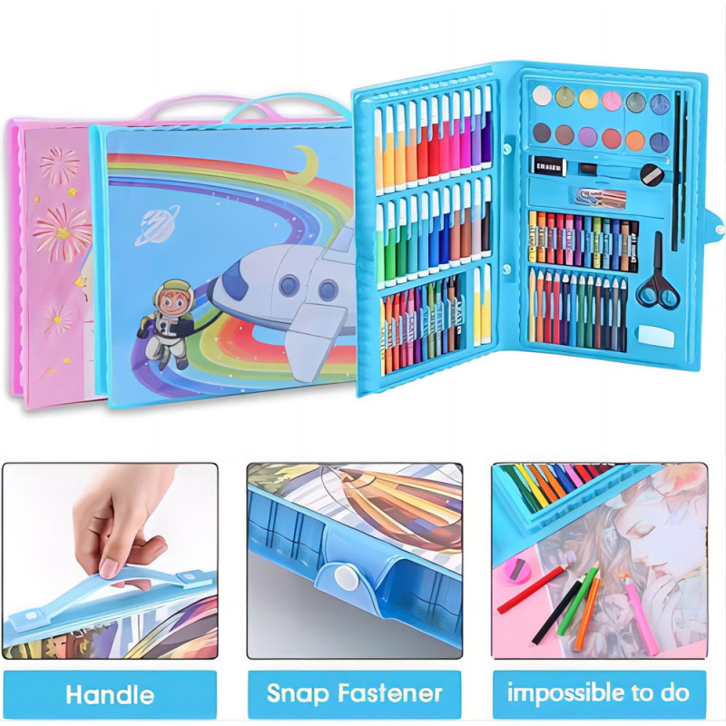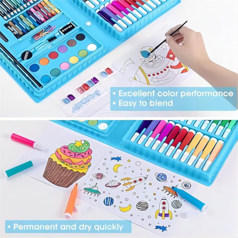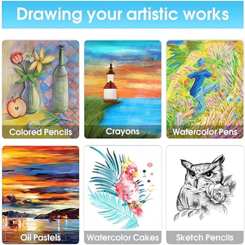 Разгърнете креативността си с този огромен арт комплект от 175 части. Събран в луксозен дървен куфар с чекмеджета, той съдържа всичко необходимо за рисуване и оцветяване – от моливи и пастели до акварелни бои и скицници.