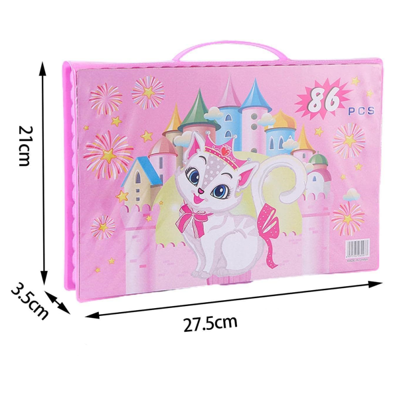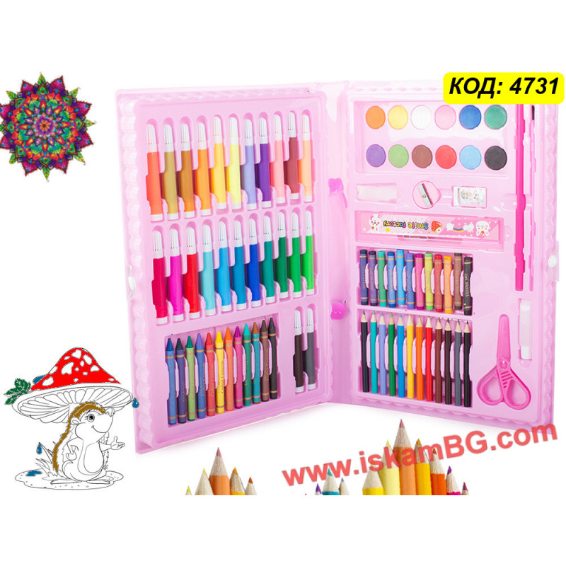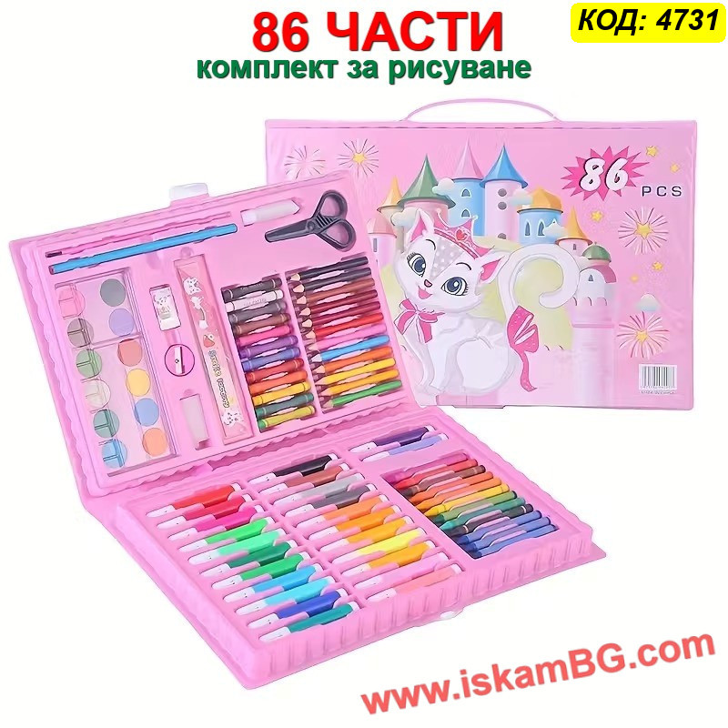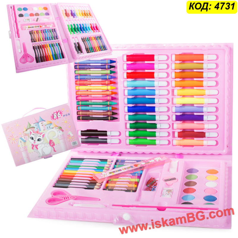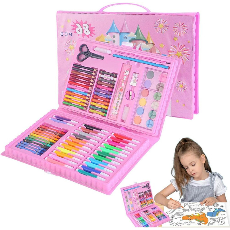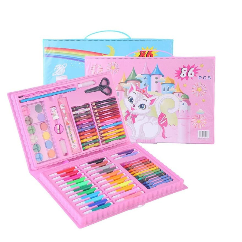 Отключете въображението на вашето дете с този огромен арт комплект от 86 части! Събран в удобно пластмасово куфарче, той включва всичко необходимо за часове творчество – от цветни моливи и пастели до акварелни бои и флумастери.
