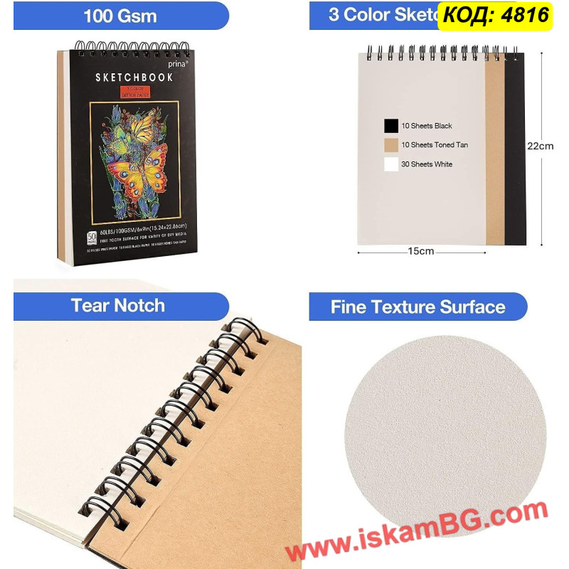 • Скицник: Спирала, 3 вида хартия (Бяла, Черна, Тонирана).