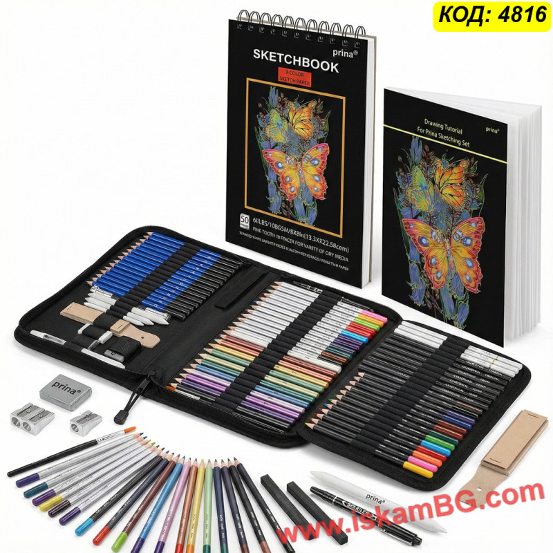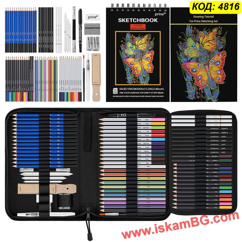 Разгърнете своя творчески потенциал с комплекта за скициране Prina от 50 части. Този "всичко-в-едно" сет съдържа професионална селекция от графитни моливи, въглени, пастели и специализирани инструменти, подредени в удобен преносим калъф. Включва и ексклузивен скицник с три цвята хартия, за да експериментирате с различни техники веднага след разопаковане.