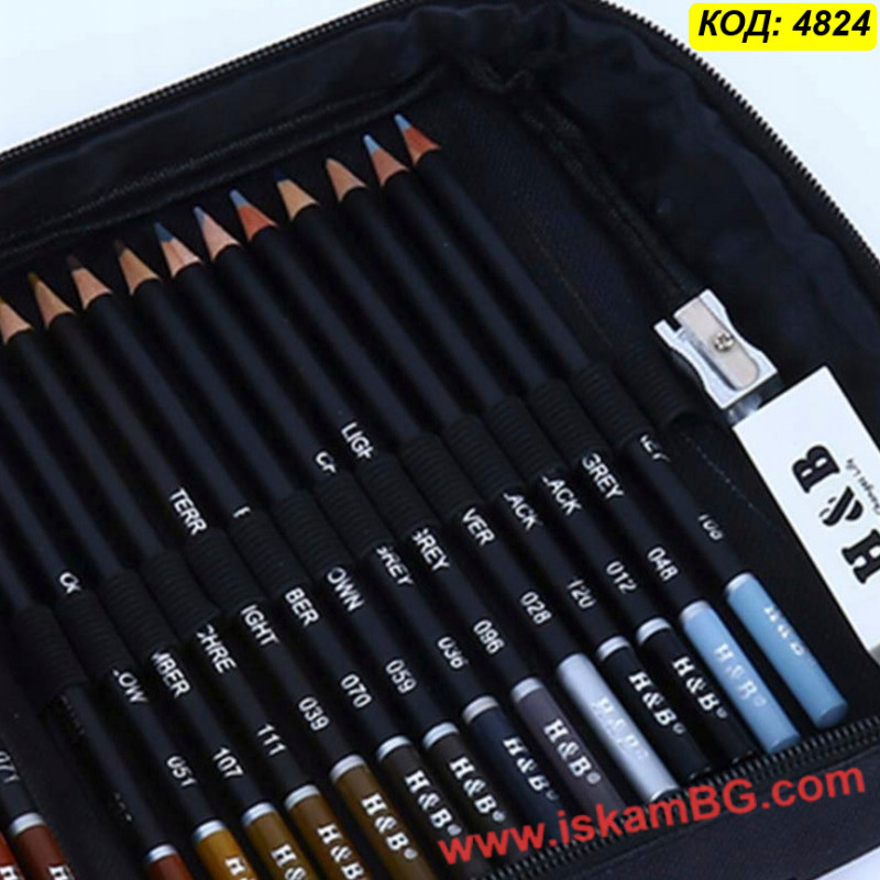Тип моливи: Черен дървен корпус, цветен код и име.