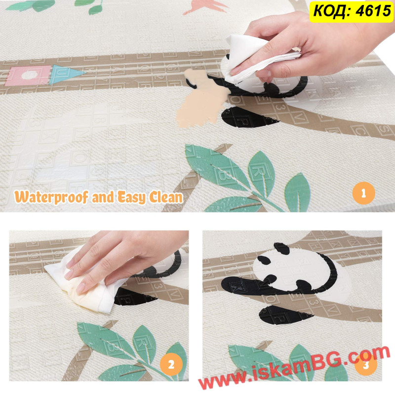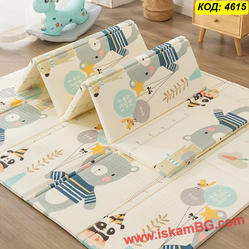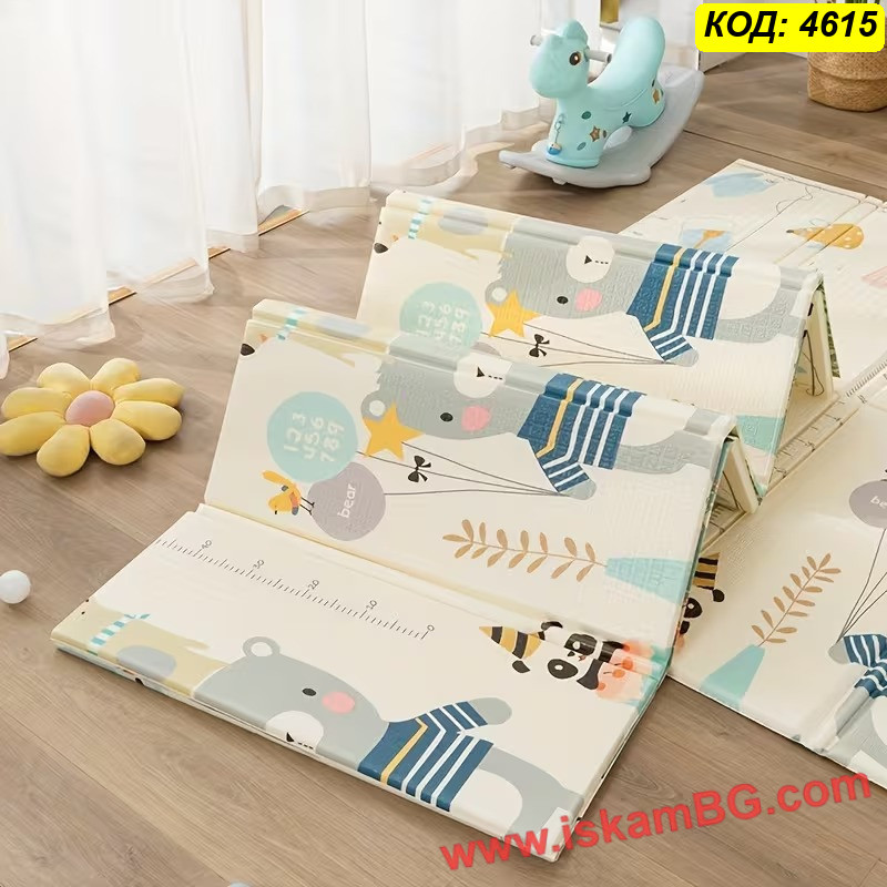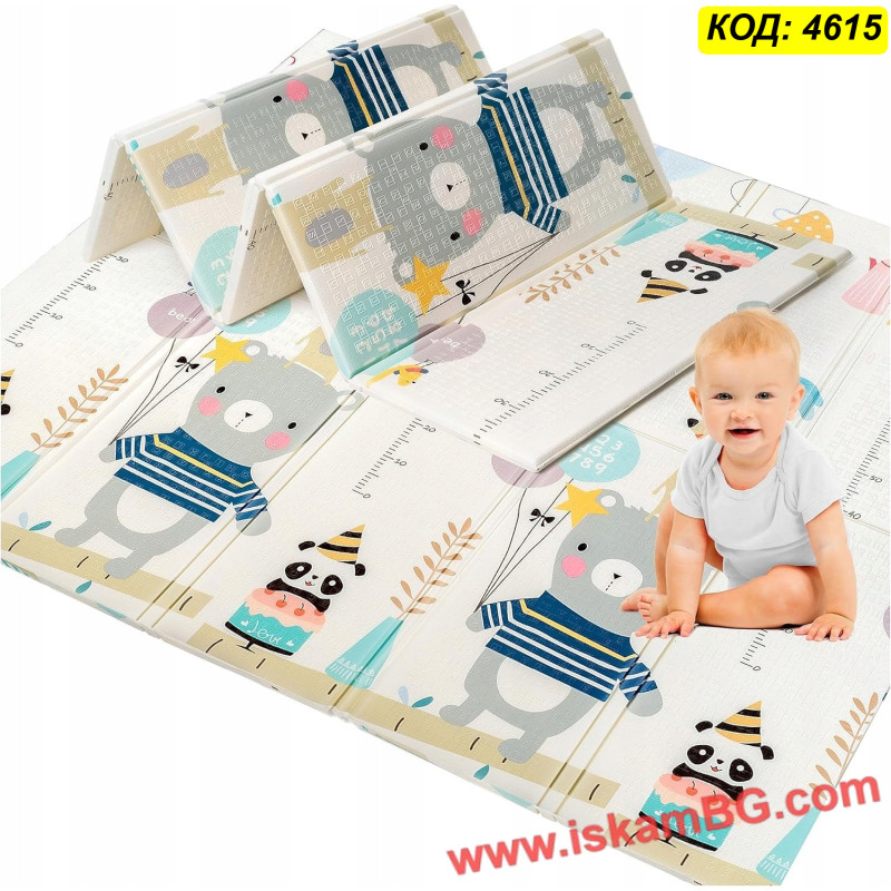 Това безопасно килимче за игра XPE е задължително за всяко бебешко пространство. С дебелина от 1 см и голям размер 200 на 180 см, то осигурява надеждна топлоизолация от студения под и отлично поглъщане на удари, гарантирайки мекота при падане и прохождане. Двулицевият дизайн предлага разнообразие – от едната страна ярките цветове и картинки (Мече с балони) спомагат за ранното когнитивно развитие, а от другата (Панди) създават уютна обстановка. Килимчето е 100% водоустойчиво и може да бъде почистено с едно избърсване, което го прави изключително хигиенично. Със своята сгъваема структура, то се прибира лесно и е удобно за пренасяне, което го прави най-добрата постелка за прохождане както у дома, така и навън.