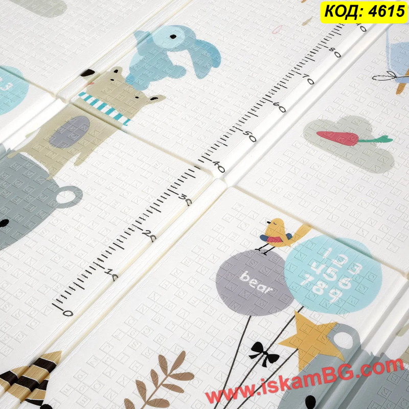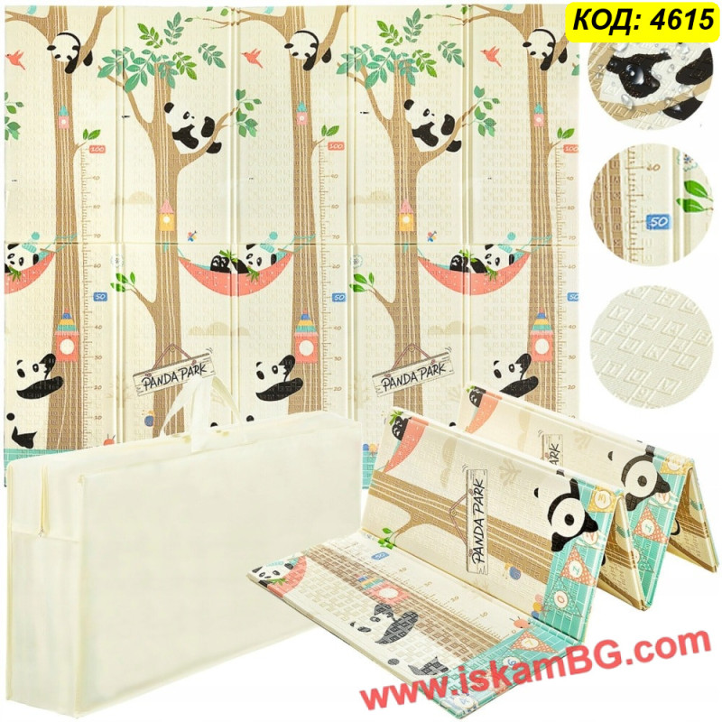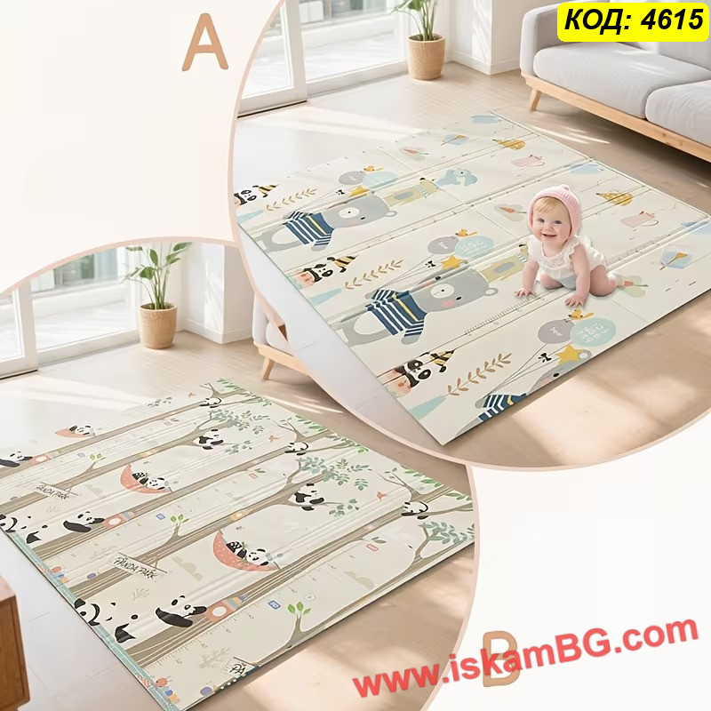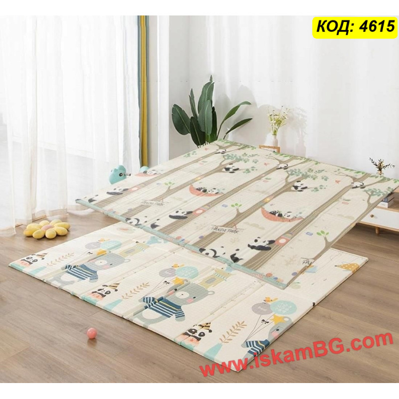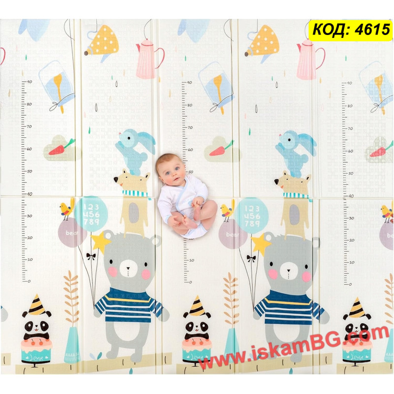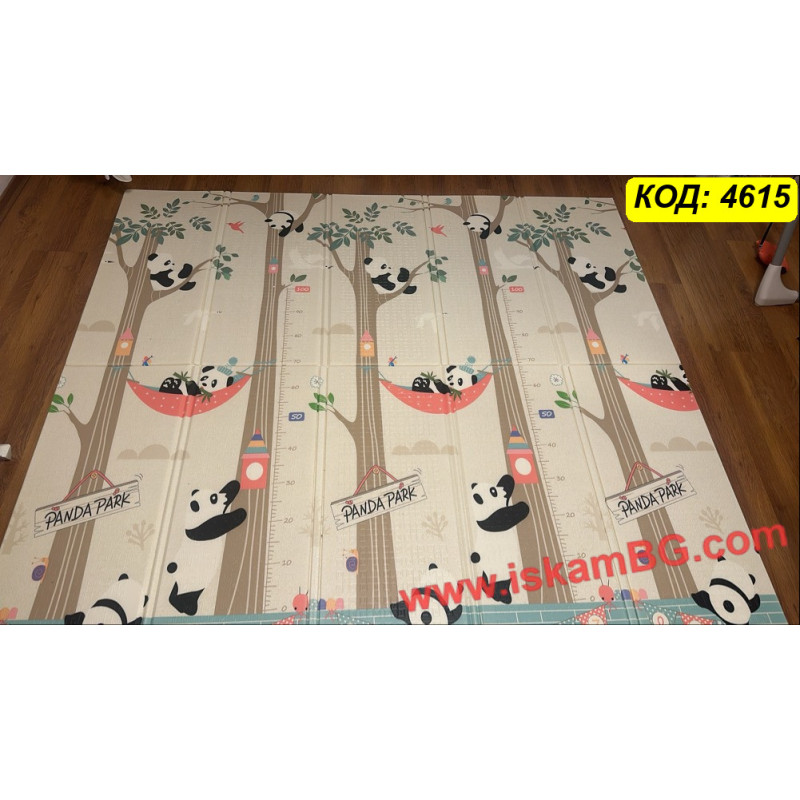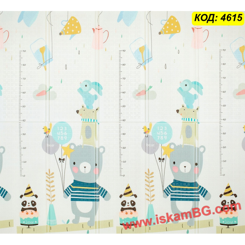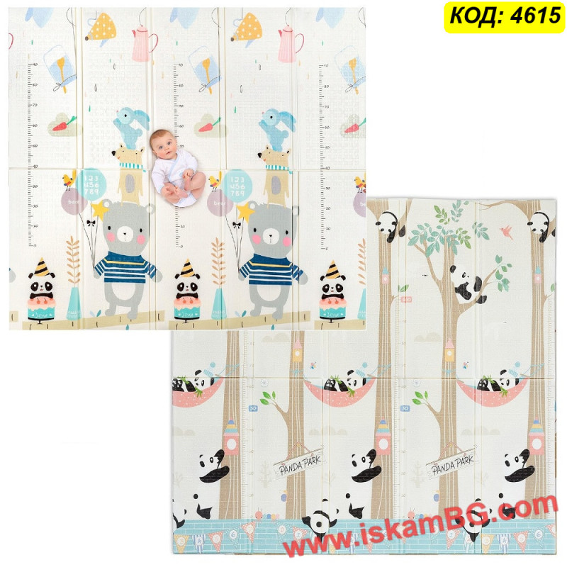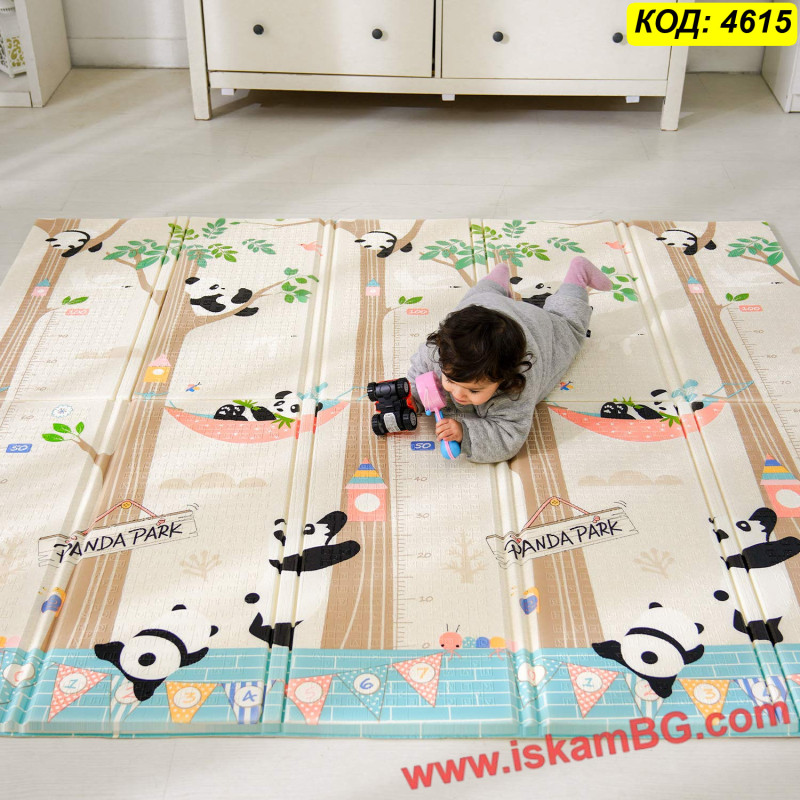 Представяме Ви голямо, двулицево меко килимче за игра с размери 200x180x1 см , изработено от нетоксична XPE пяна, перфектно за прохождане и активна игра. Едната страна е със забавен дизайн Мече с балони и ростомер , а другата е с мотив Панди в парка, предлагайки максимално стимулиране на Вашето бебе.    Виж пълното описание