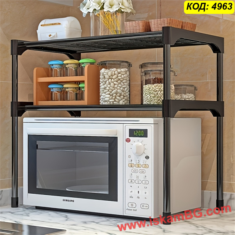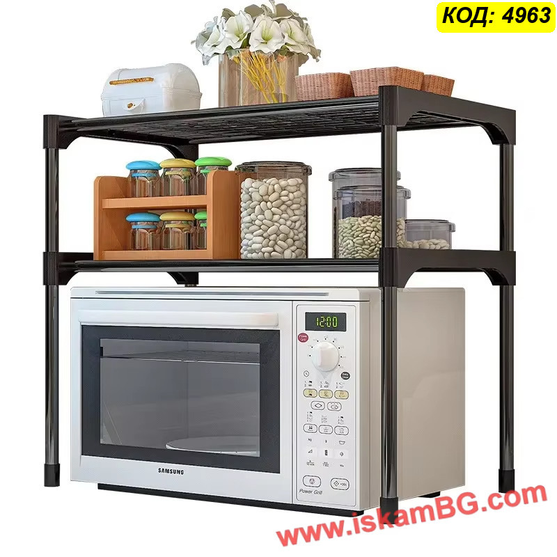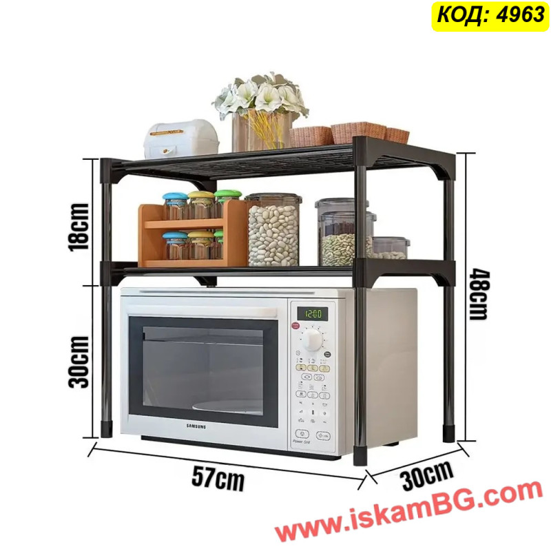 Практична етажерка за микровълнова с 2 нива, която освобождава място на плота и подрежда подправки, буркани, съдове и дребни кухненски аксесоари. Метална конструкция с покритие за лесно почистване и решетъчен дизайн за по-малко прах и по-добра вентилация. Размери: 57*30*48 см.