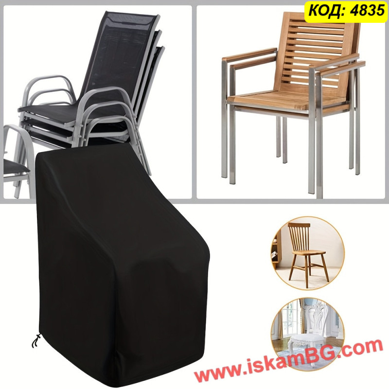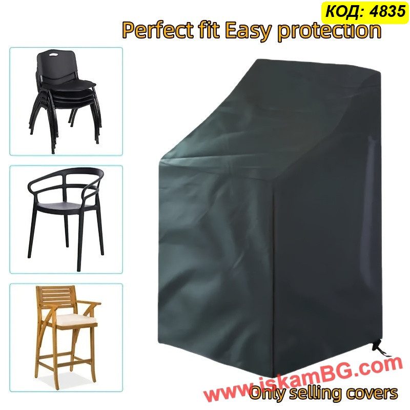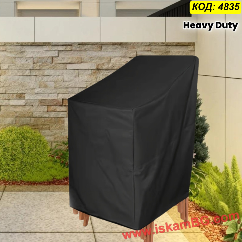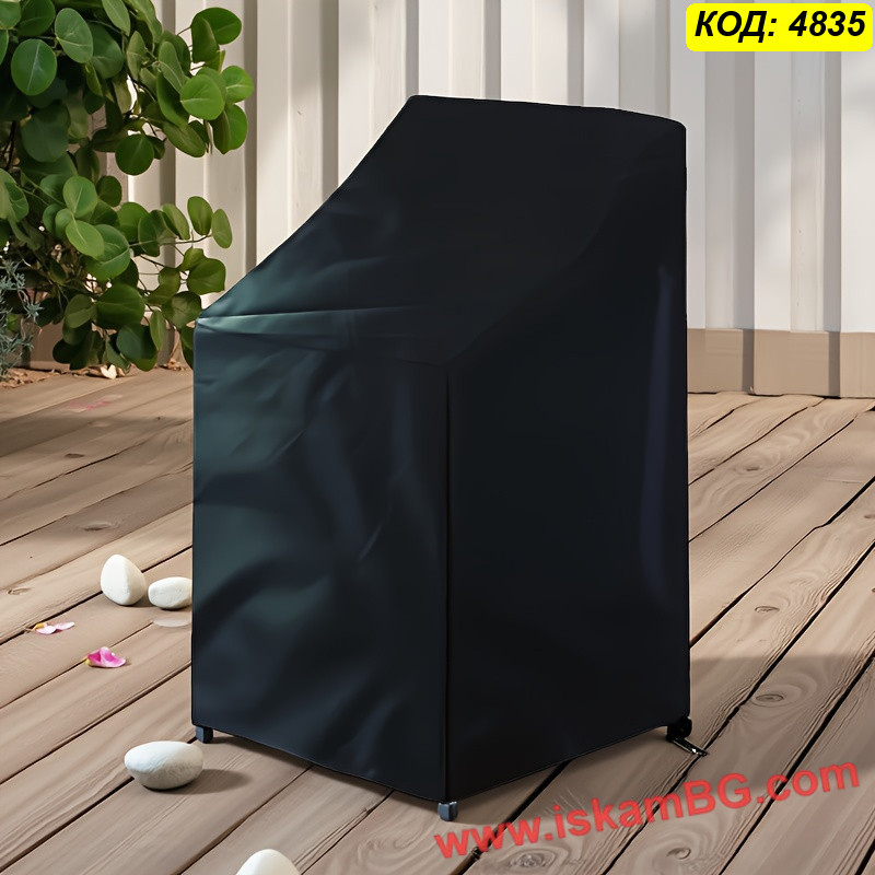 Изработено от здрав полиестер 210D Oxford, покривалото е устойчиво на разкъсване и атмосферни влияния. Формата му е специално скосена (70 см отпред), за да пасва перфектно на контура на подредените столове, предотвратявайки събирането на вода върху седалката на най-горния стол. Черният цвят е практичен и не показва замърсявания, което го прави отличен избор за дългосрочна употреба на открито.