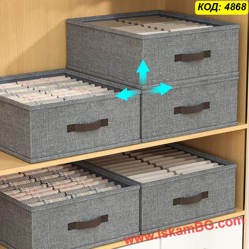 Оптимизирайте пространството в дома си с нашия голям текстилен органайзер за дрехи с размери 50x50x20 см. Идеалното решение за подредба на дънки, пуловери и тениски в гардероба или чекмеджето. Сгъваем, дишащ и изключително здрав.