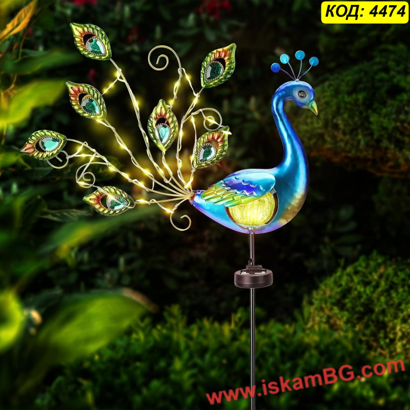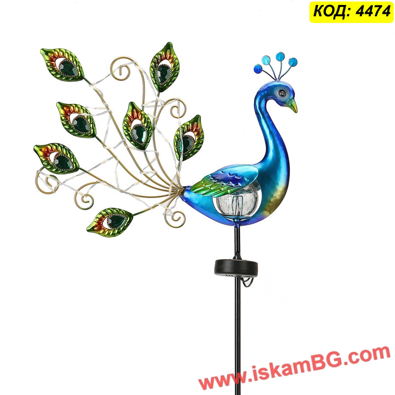 Декоративна градинска лампа със соларен панел "Паун" - с вдигната опашка
