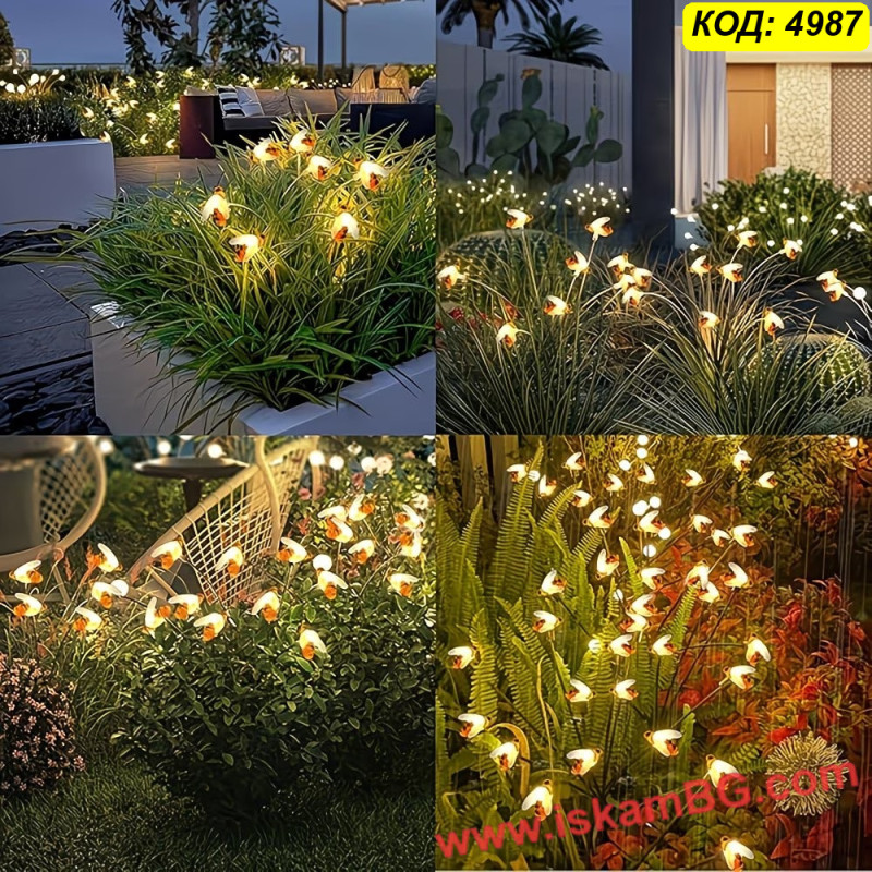 Цветни соларни лампи за градина с пеперуди, създадени за ефектна външна декорация на двор, алеи, цветни лехи и градински кътове. Лампите се зареждат от слънцето през деня и светят автоматично вечер с многоцветна RGB LED светлина. Дизайнът с пеперуди и фиброоптични влакна създава красиво сияние и впечатляващ декоративен ефект, а гъвкавите стъбла се поклащат леко от вятъра и придават усещане за движение.