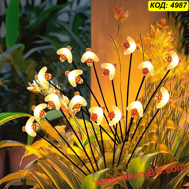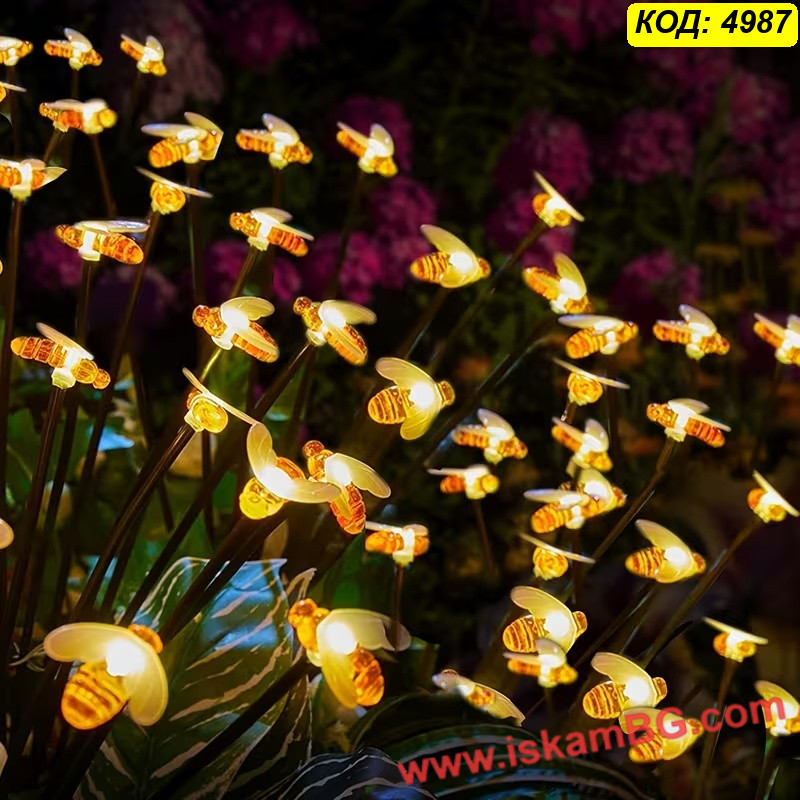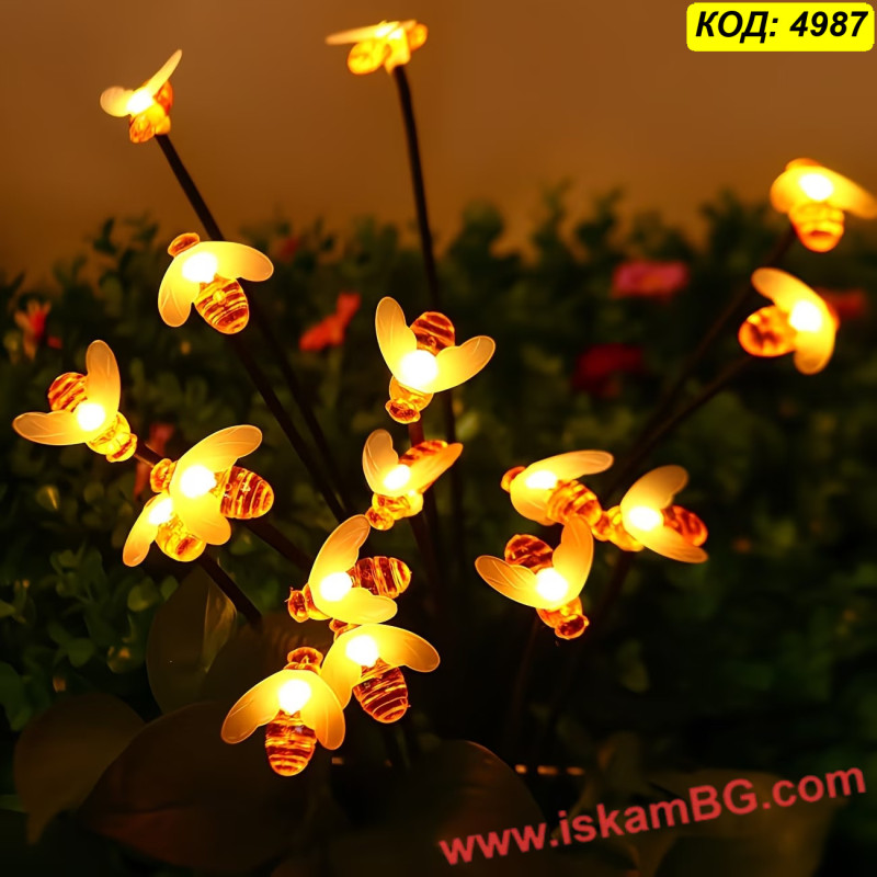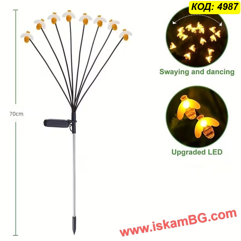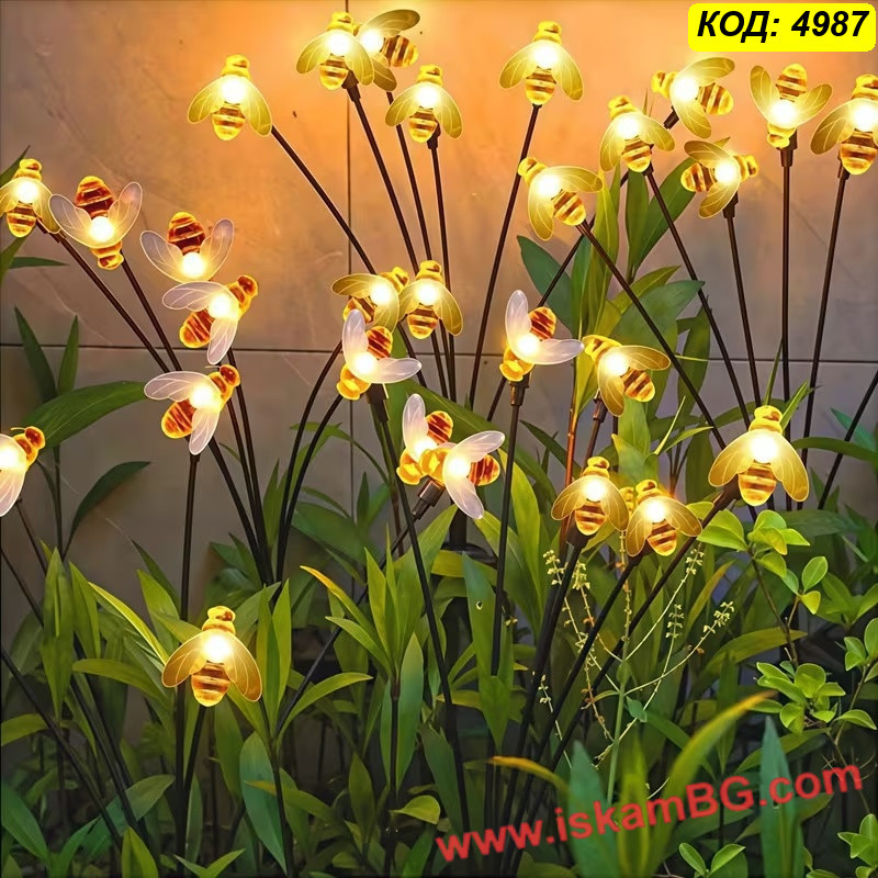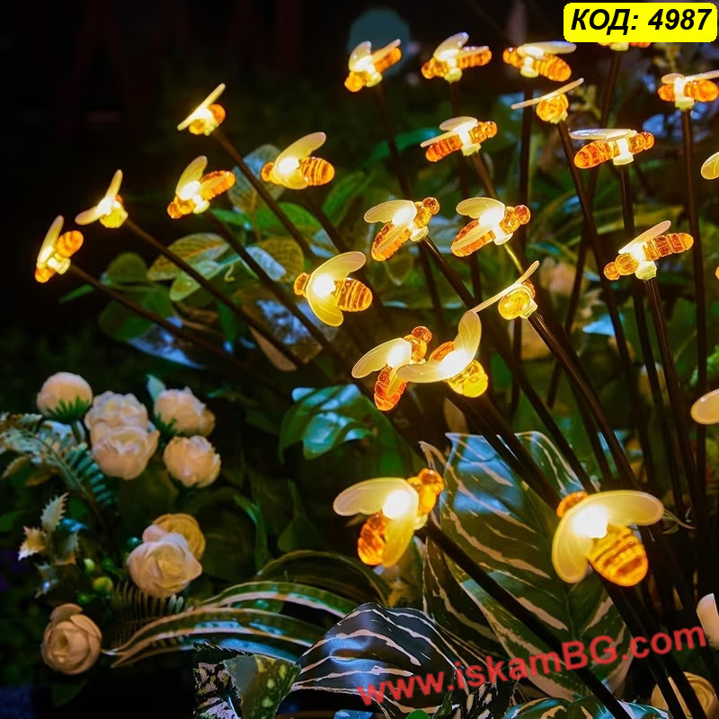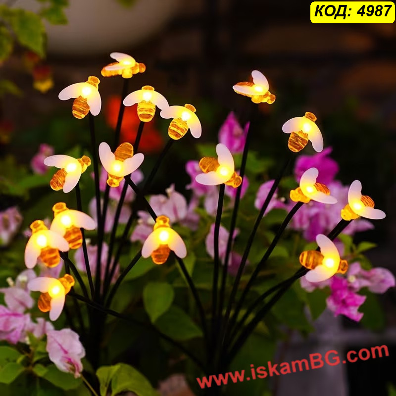 Лампите са оформени като 10 светещи пчелички, разположени върху гъвкави стъбла. При лек вятър те се поклащат и създават приятен люлеещ ефект, който напомня на реещи се пчели над растенията. Освен като декоративна градинска украса, този модел е практичен и за меко акцентно осветление във външни пространства.