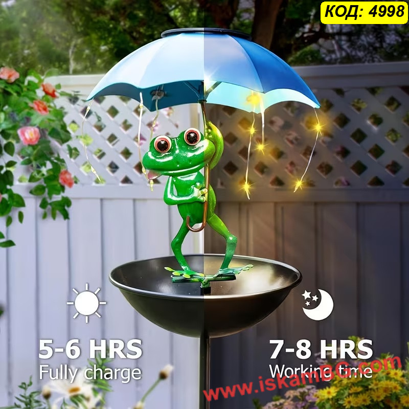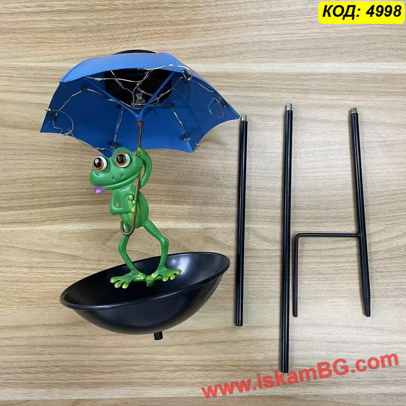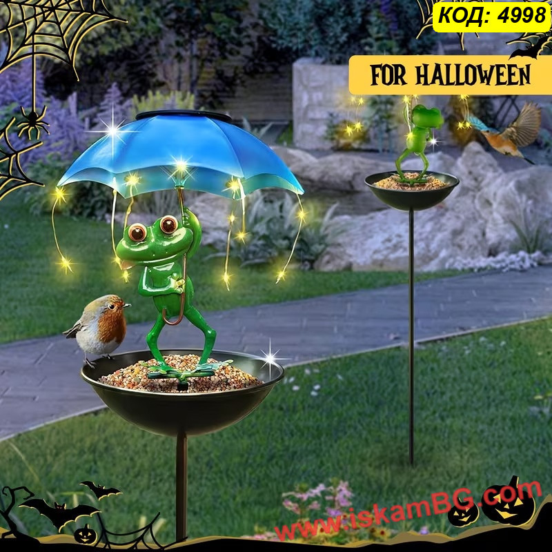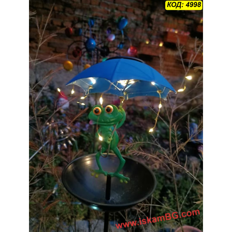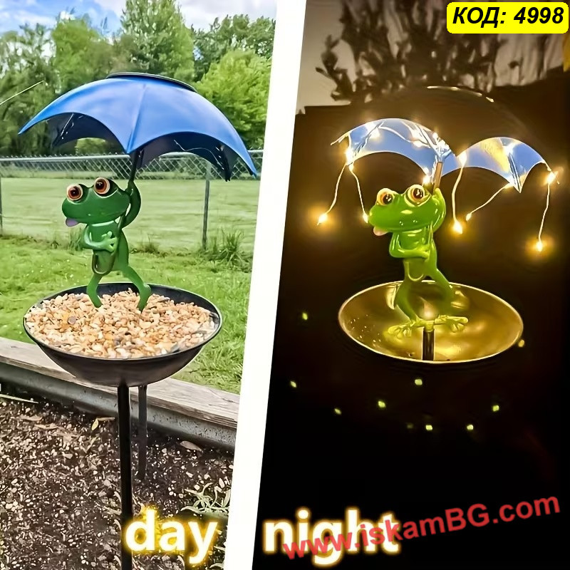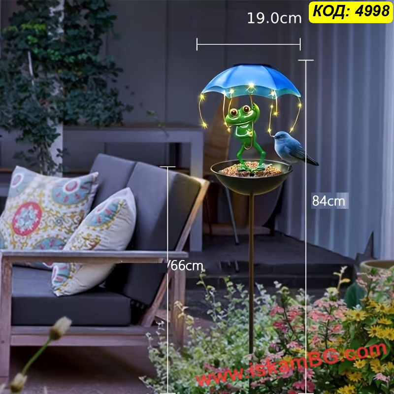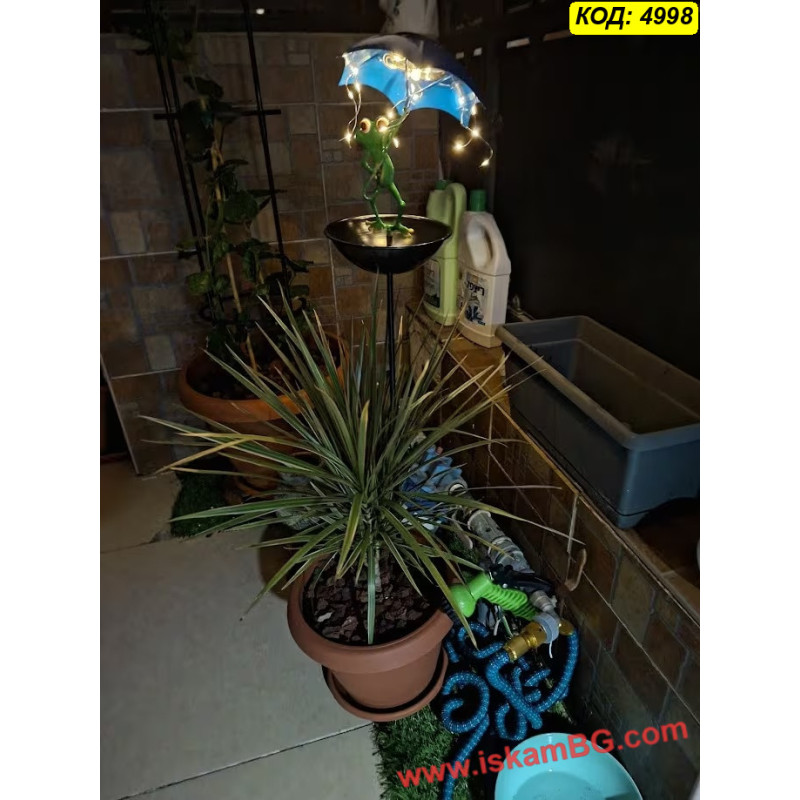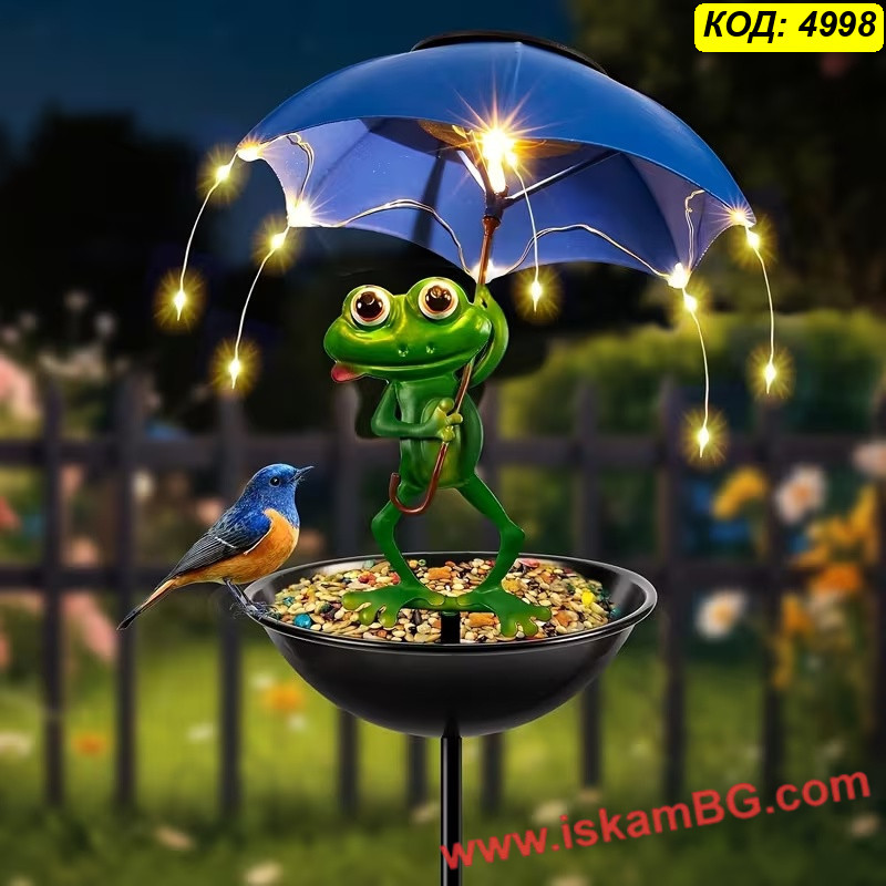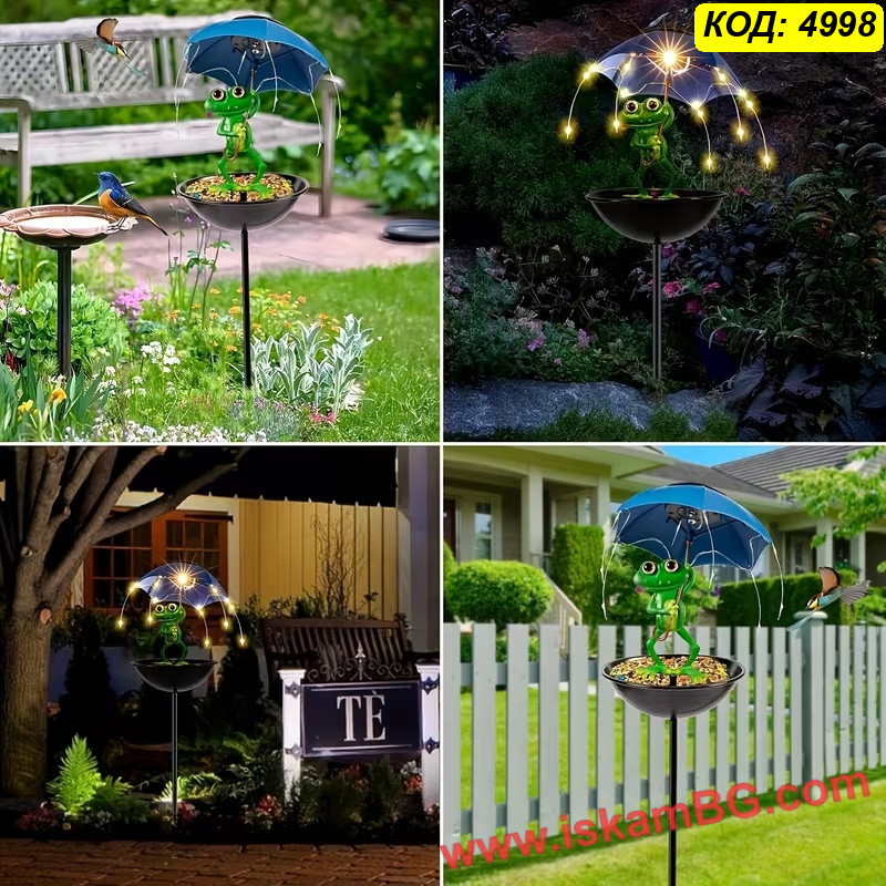 1 брой декоративна соларна лампа за градина Жаба с чадър, хранилка и поилка за птици