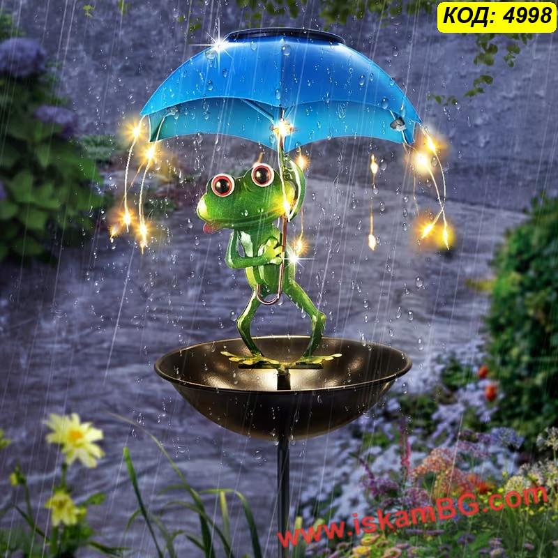 Декоративната соларна лампа за градина Жаба с чадър е интересен и практичен избор за хора, които искат едновременно украса и функционалност във външното пространство. Моделът комбинира декоративна фигура на жаба, соларно LED осветление и купа, която може да се използва като хранилка или поилка за птици.