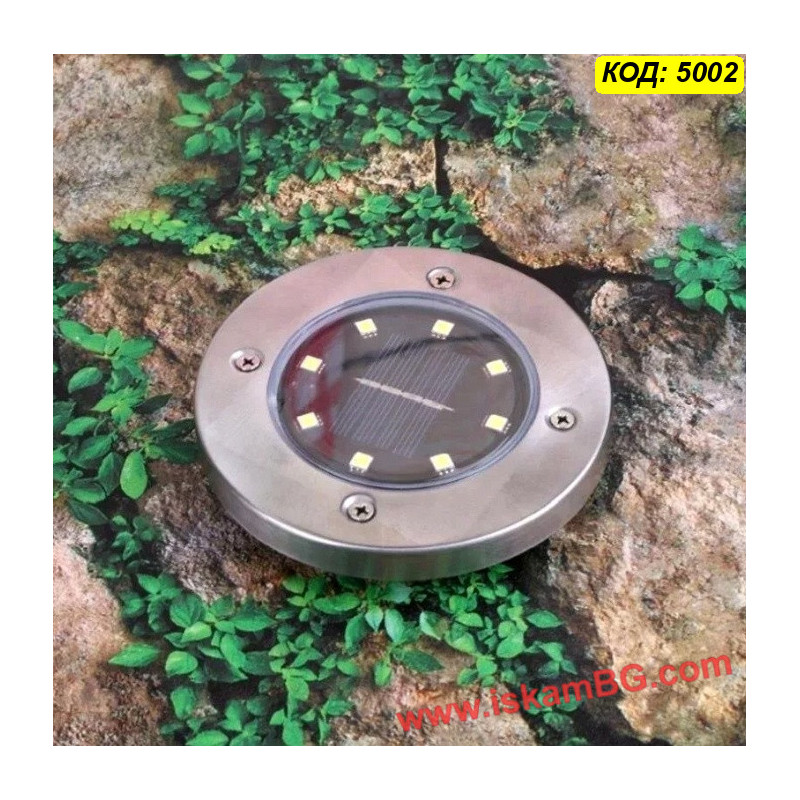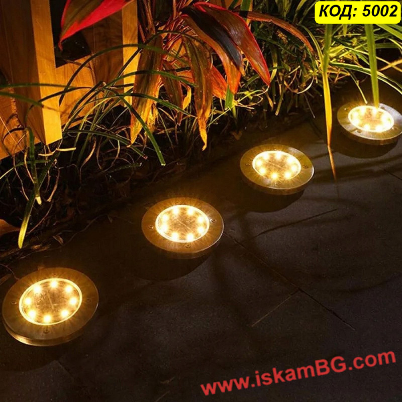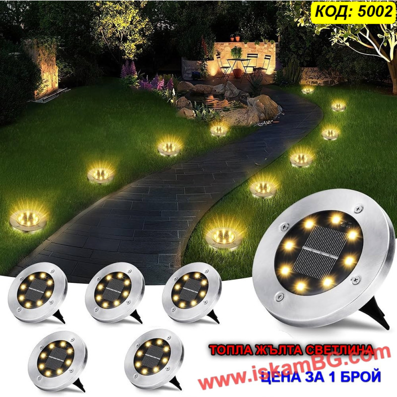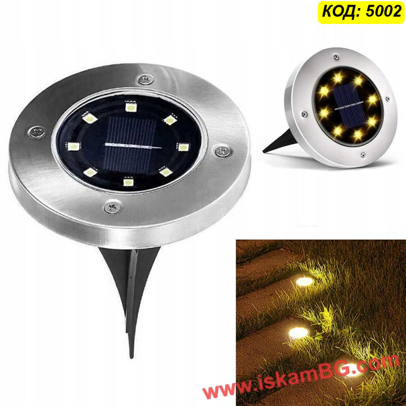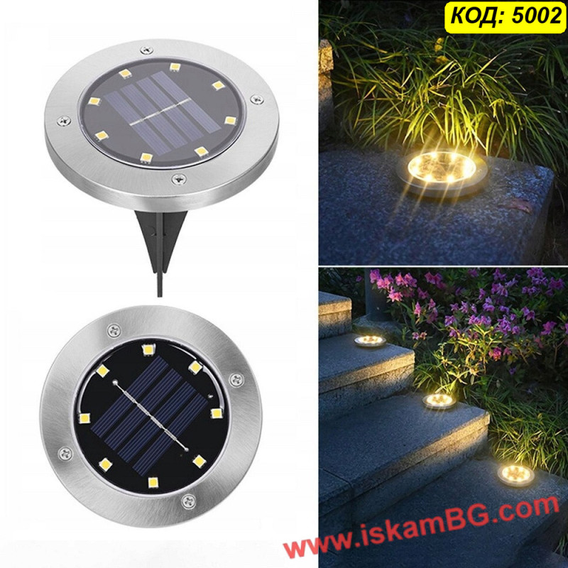 1 брой соларна LED лампа за земя Disk Lights - 8 LED, топла жълта светлина, инокс