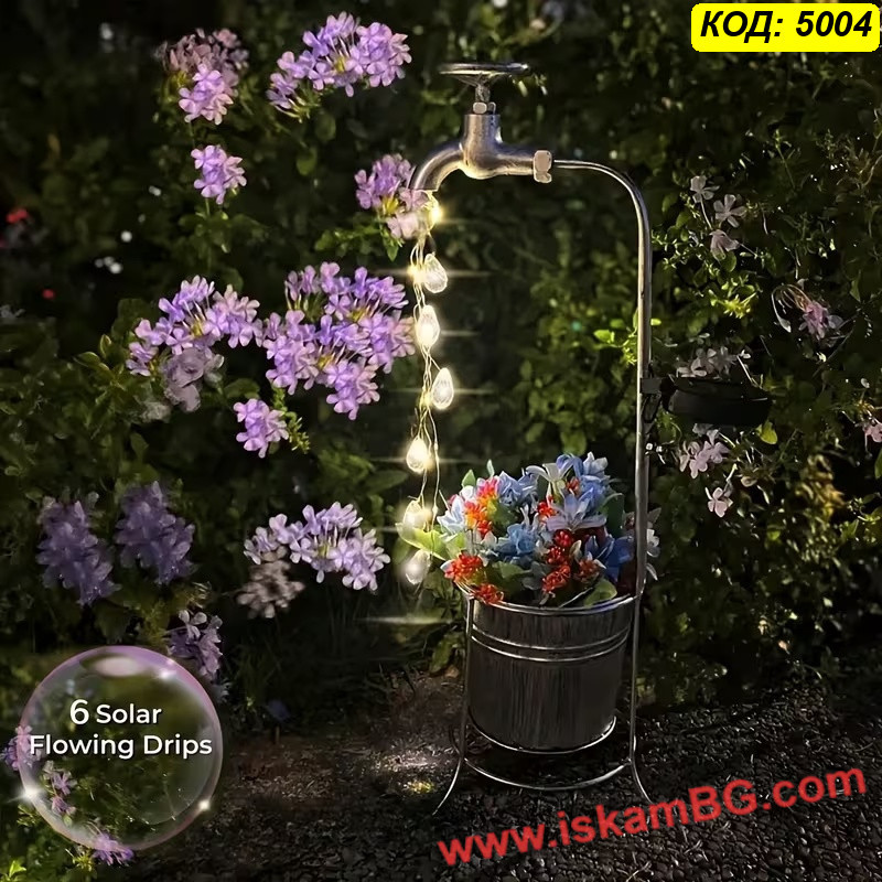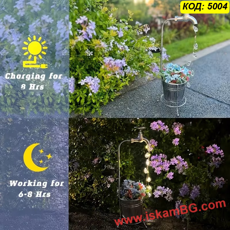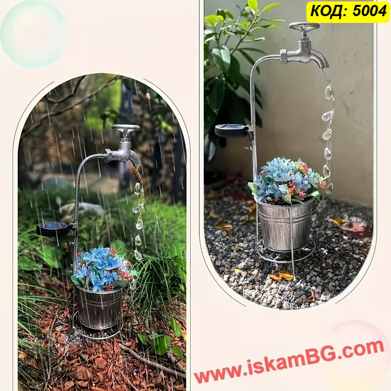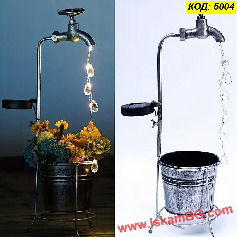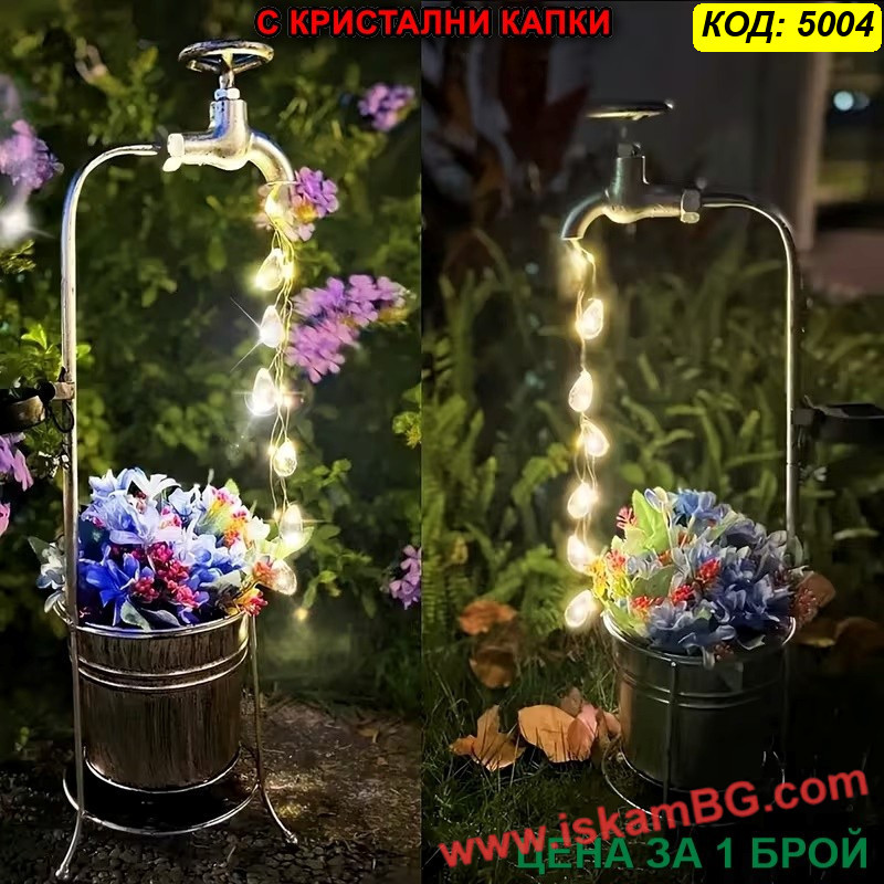 Соларната градинска лампа „Вълшебна чешма“ е декоративен модел за хора, които искат да добавят по-интересен и артистичен акцент във външното пространство. Дизайнът е вдъхновен от старинна чешма, от чийто чучур се спускат LED нишки, наподобяващи падащи кристални капки вода. Така продуктът съчетава декоративна визия през деня и красив светлинен ефект вечер.