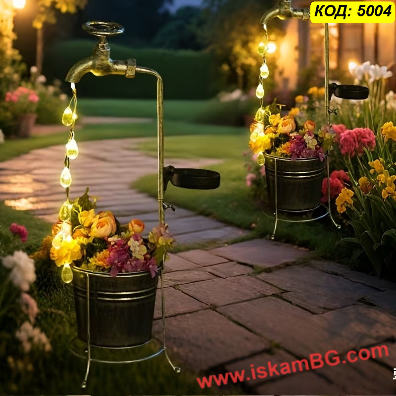 Соларна градинска лампа „Вълшебна чешма“ с кристални капки и метална саксия е декоративен външен акцент, който съчетава ефектно осветление и място за цветя. LED нишките създават илюзия за течаща светлинна вода, а вградената саксия позволява да добавите растения и да оформите още по-красива градинска композиция. Подходяща е за двор, цветни лехи, тераса, алеи и декоративни кътове.    Виж пълното описание