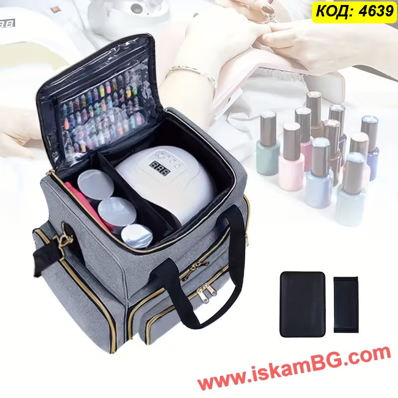 Представяме Ви специализираната чанта органайзер за лакове и отделение за лампа за нокти, която предлага двуслойна, сигурна и професионална подредба на всички Ваши инструменти и консумативи за ноктопластика.