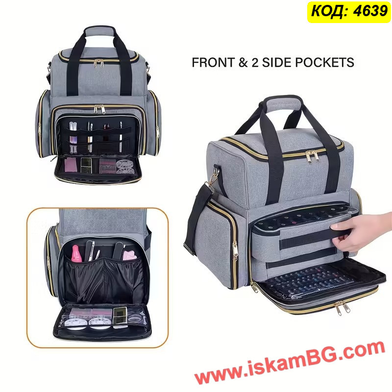 Спрете да жонглирате с различни несесери! Тази професионална чанта за маникюр организира цялото ви оборудване на едно място. Разполага със специално отделение за UV/LED лампа и два подвижни органайзера, събиращи общо 80 гел лака. Идеална за мобилни маникюристи и перфектна организация у дома.