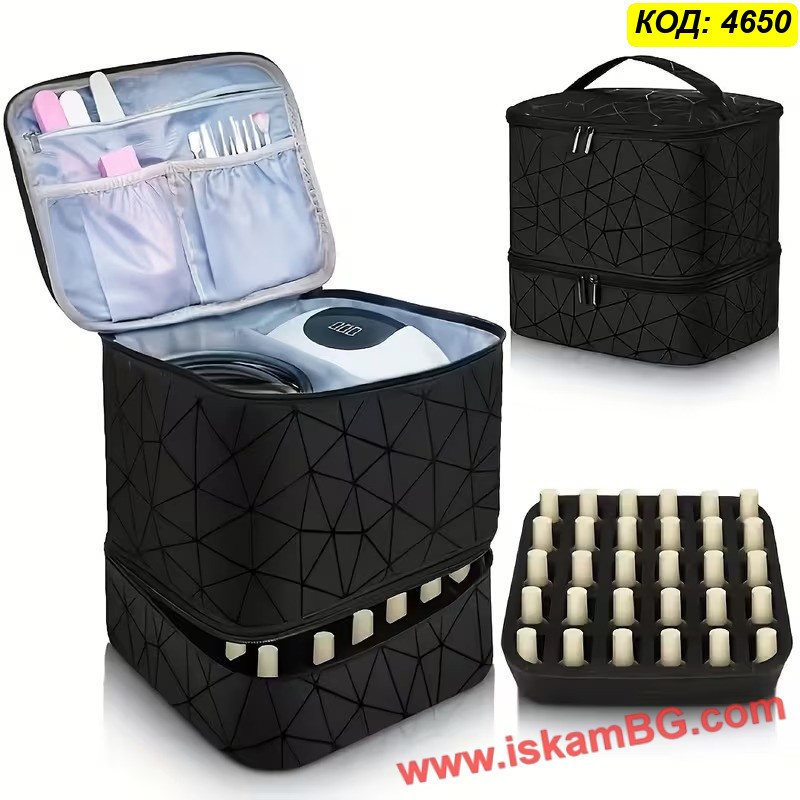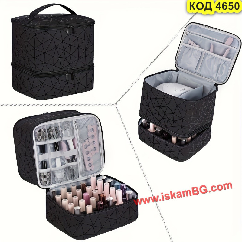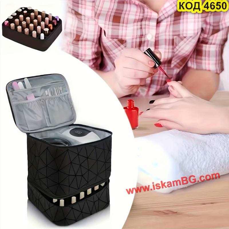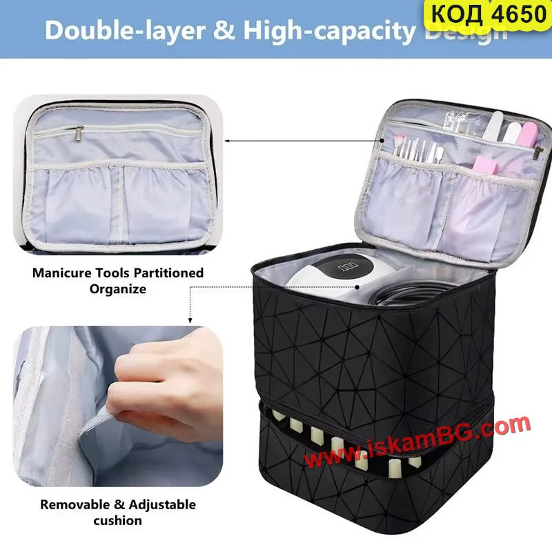 Сложете край на хаоса с вашите принадлежности за маникюр! Тази професионална чанта-органайзер е интелигентното решение за съхранение и пренасяне на цялото ви оборудване. Благодарение на интелигентния си двуетажен дизайн, тя разделя перфектно вашата UV лампа от лаковете, като предпазва всичко от повреди.