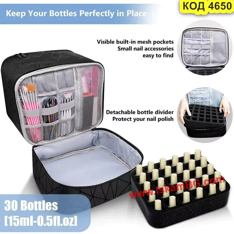 Горното просторно отделение е проектирано да побере повечето UV/LED лампи със стандартен размер, като същевременно разполага с джобове и еластични ленти за вашите пили, четки, избутвачи и други аксесоари. Долното отделение съдържа подвижен разделител от мека пяна с 30 гнезда, който държи всяко шишенце гел лак изправено и защитено от удари и счупване.