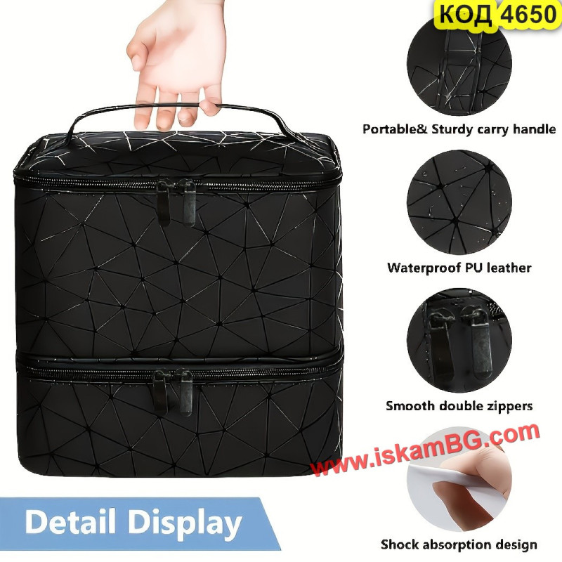 Изработена от здрав и лесен за почистване материал със стилен геометричен десен, тази чанта е идеална както за мобилни маникюристи, така и за ентусиасти, които искат да запазят колекцията си перфектно организирана у дома. Удобната подсилена дръжка я прави лесна за пренасяне навсякъде.