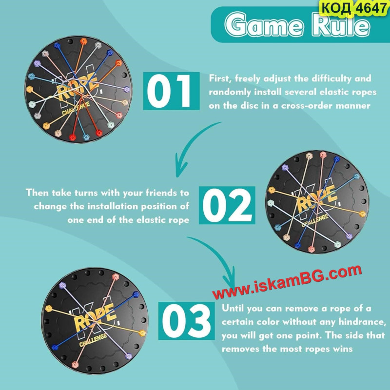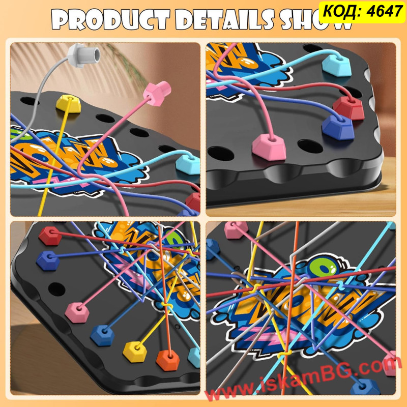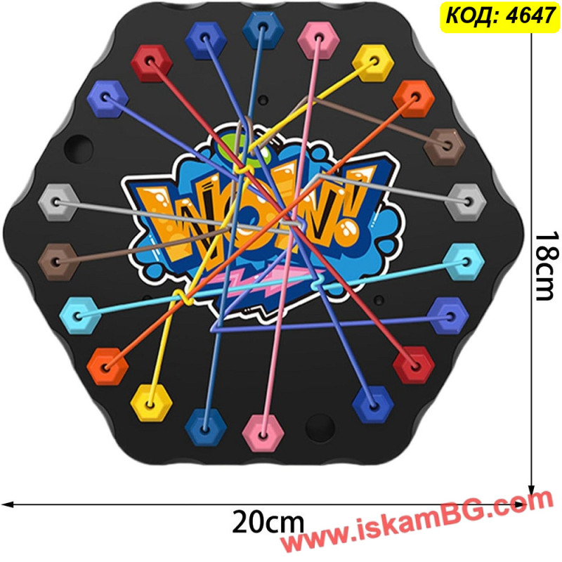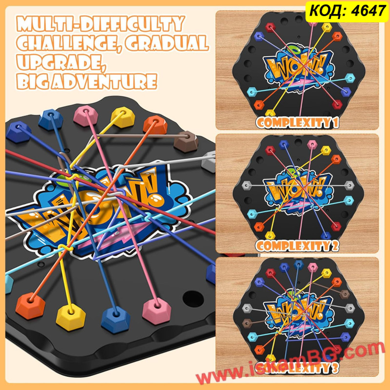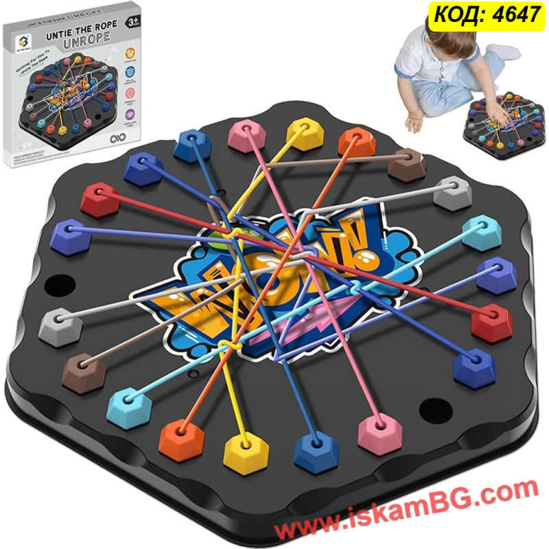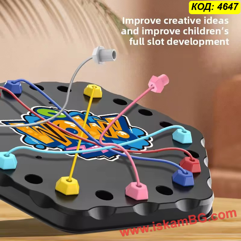 Тази иновативна настолна игра-пъзел с въжета превръща решаването на проблеми в изключително забавно и ангажиращо преживяване за цялото семейство. Със своята уникална механика, базирана на премахването на цветни връзки от дъската, тя ефективно развива стратегическото мислене и концентрацията. Комплектът съдържа разнообразни конфигурации, които осигуряват плавна крива на трудност – от лесни задачки за начинаещи до сложни предизвикателства за напреднали. Играта е отличен инструмент за подобряване на координацията око-ръка и пространственото въображение. Използвайте тази логическа игра с въжета за качествено семейно време или като умствена гимнастика, която ви помага да поддържате мозъка си във форма. Това е перфектната алтернатива на дигиталните игри.