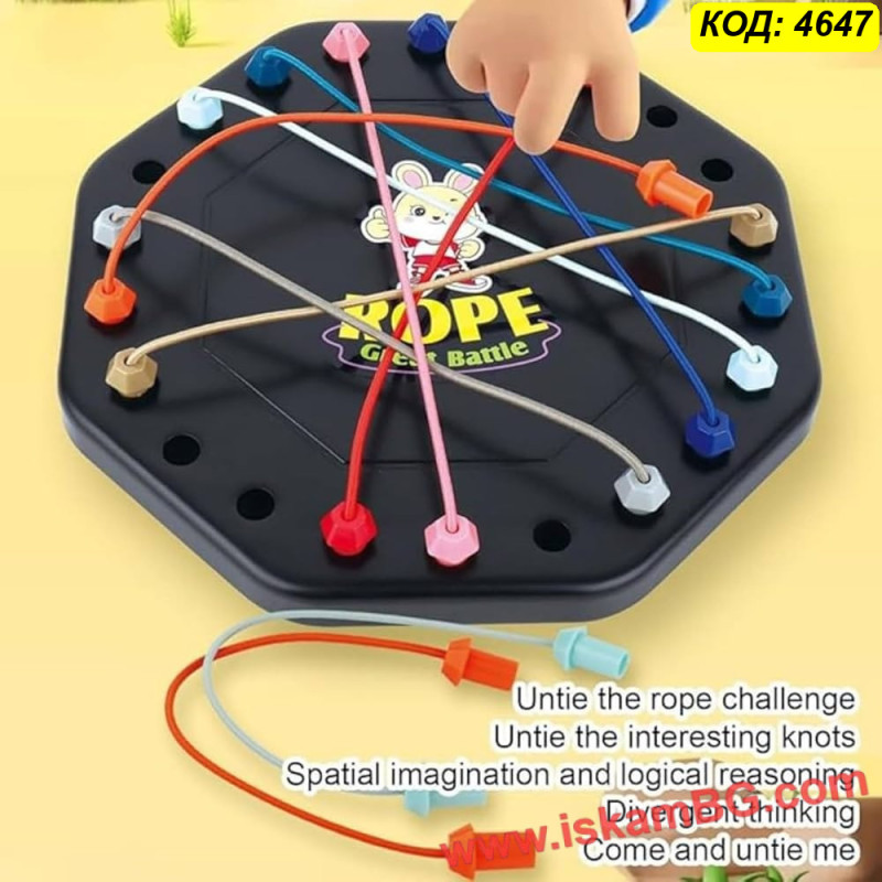 Представяме ви логическа настолна игра-пъзел с въжета – идеалното предизвикателство за стимулиране на ума както при децата, така и при възрастните. Тя предлага множество логически главоблъсканици, които изискват стратегическо мислене и прецизна фина моторика за успешното разплитане на възлите .    Виж пълното описание