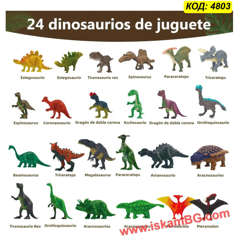Фигури: Комплект от 14 (Среден) или 24 (Голям) цветни динозавърски фигури.