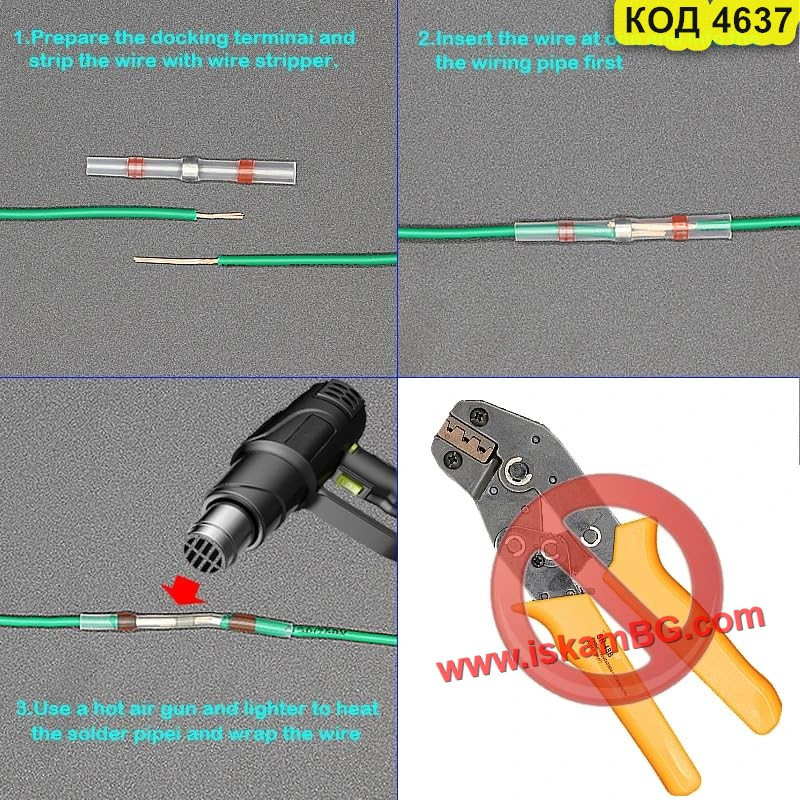 Основно описание на продукта: Забравете за сложните методи на запояване и несигурните връзки с кримпване. Нашият комплект термосвиваеми конектори с припой (тинол) е иновативно решение "всичко в едно" за всеки електротехник, автомонтьор или "направи си сам" ентусиаст. Всеки конектор комбинира висококачествен термосвиваем шлаух, пръстен от нискотемпературен припой и два уплътнителни пръстена от термопластично лепило.