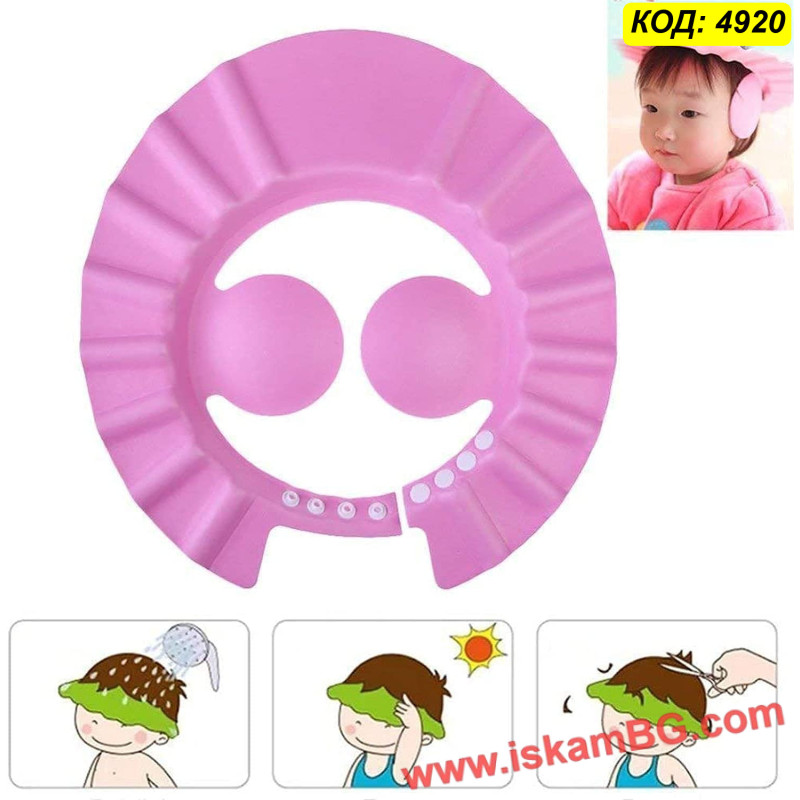 Нежна розова шапка с козирка за къпане за момиче, без ушанки, създадена за защита и комфорт по време на миене.