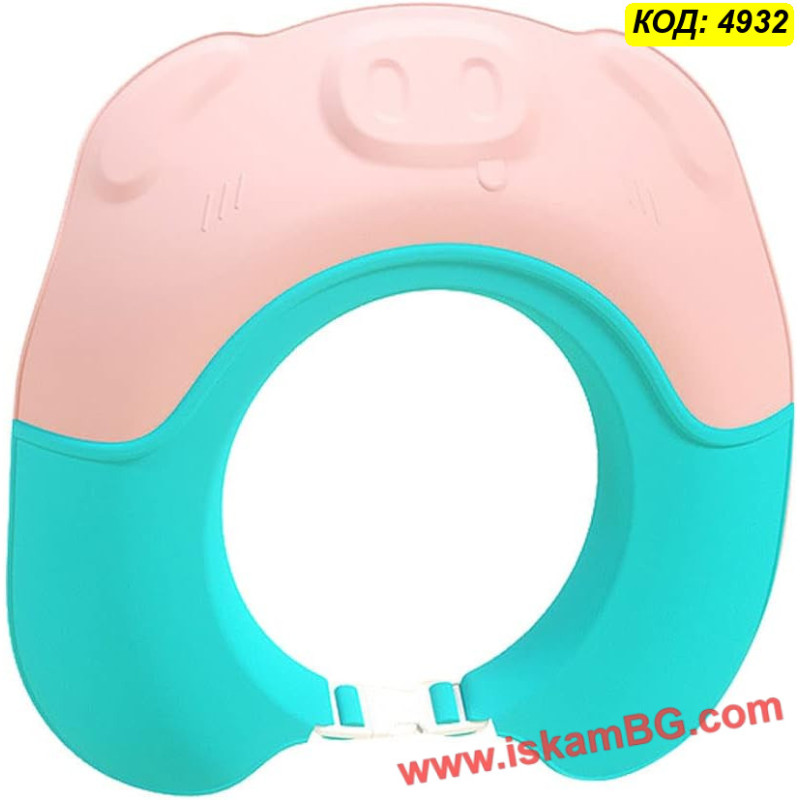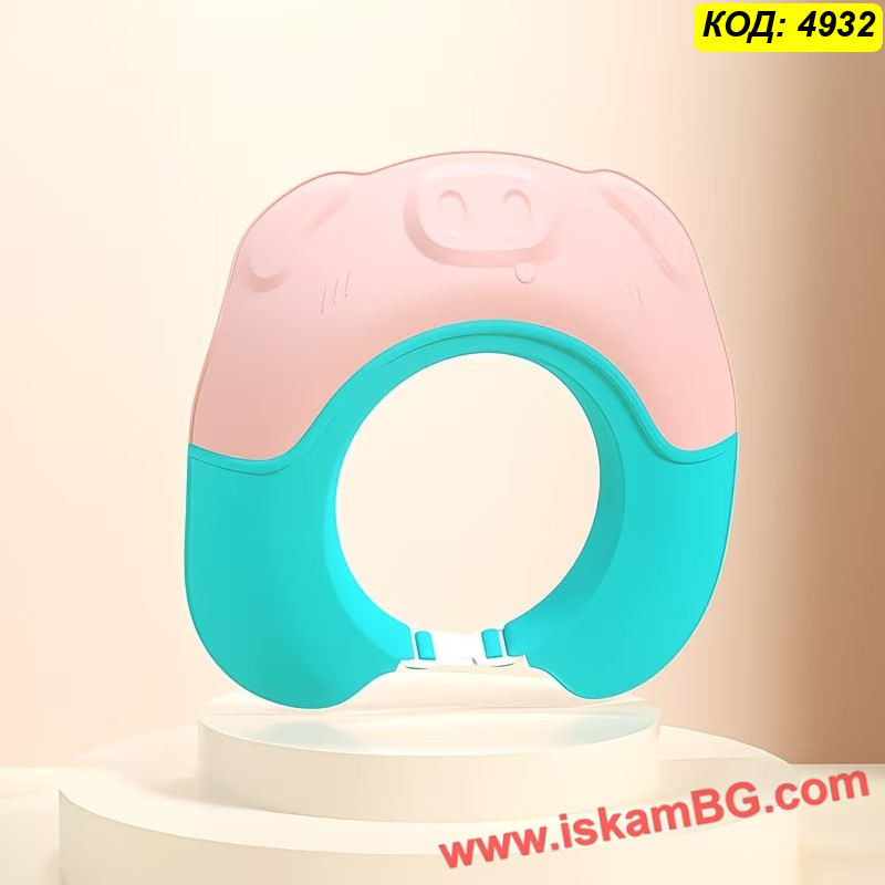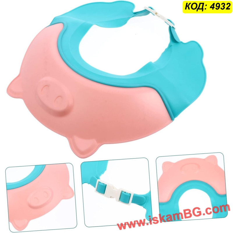 Забавна и практична шапка за къпане на дете с голяма козирка и дизайн „Прасенце“. Осигурява ефективна защита на очите и ушите, отвежда водата назад и прави къпането по-лесно и приятно.