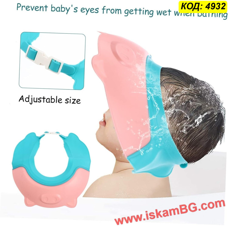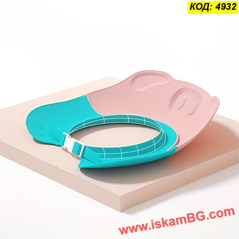 Нежна и практична шапка за къпане на дете с голяма козирка в цветове розово и мента. Осигурява ефективна защита от вода и шампоан и превръща къпането в приятно изживяване.    Виж пълното описание
