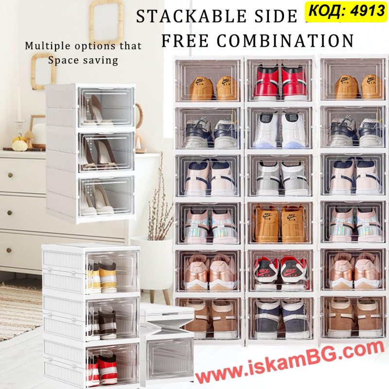 Практичен и естетичен начин да съхраните любимите си обувки. Тази прозрачна пластмасова кутия осигурява 30% повече пространство и 100% видимост на съдържанието. Със своята сгъваема конструкция и модулен дизайн, тя ви позволява да създадете собствен шкаф за обувки, който предпазва от прах, влага и деформации. Подходяща както за дамски, така и за мъжки обувки.